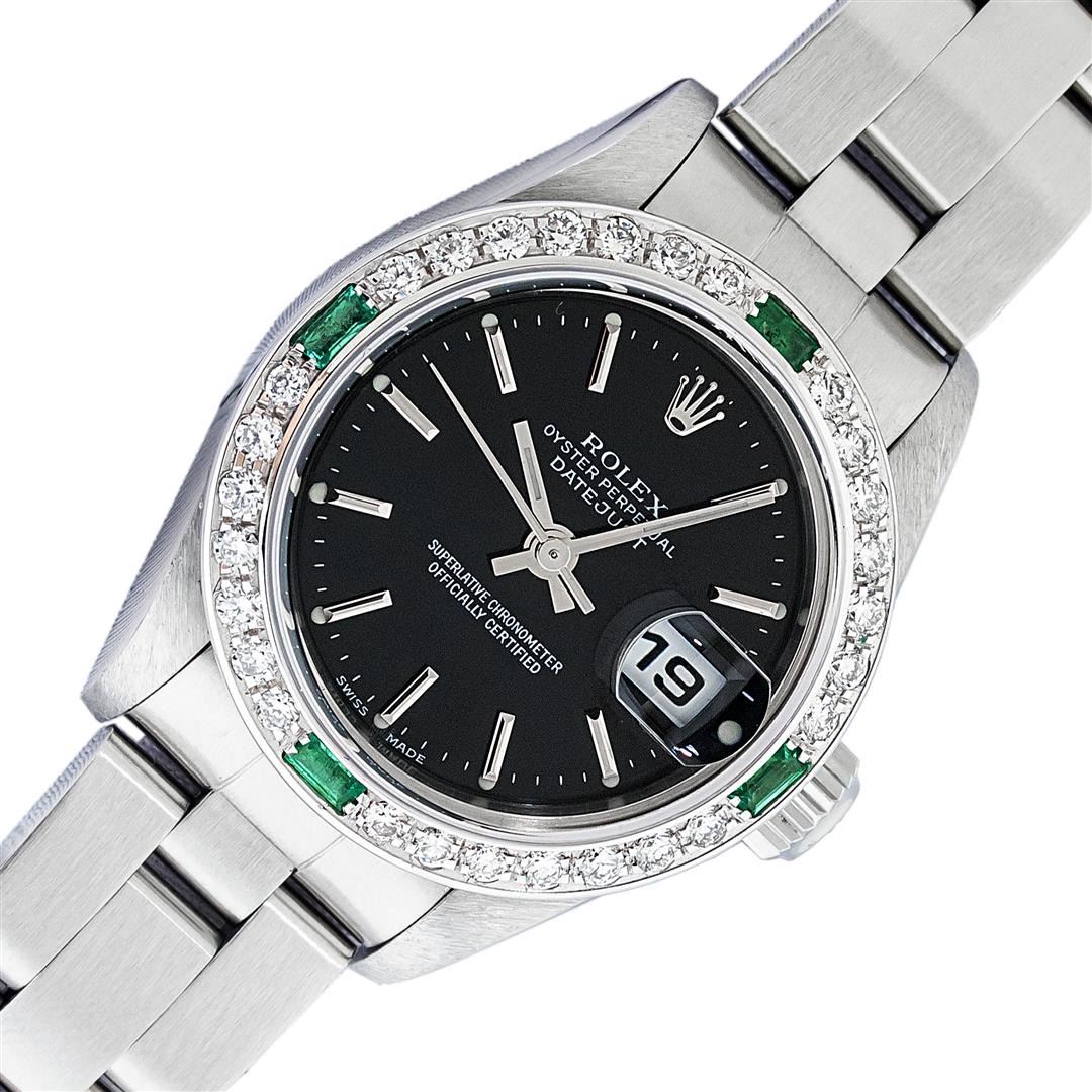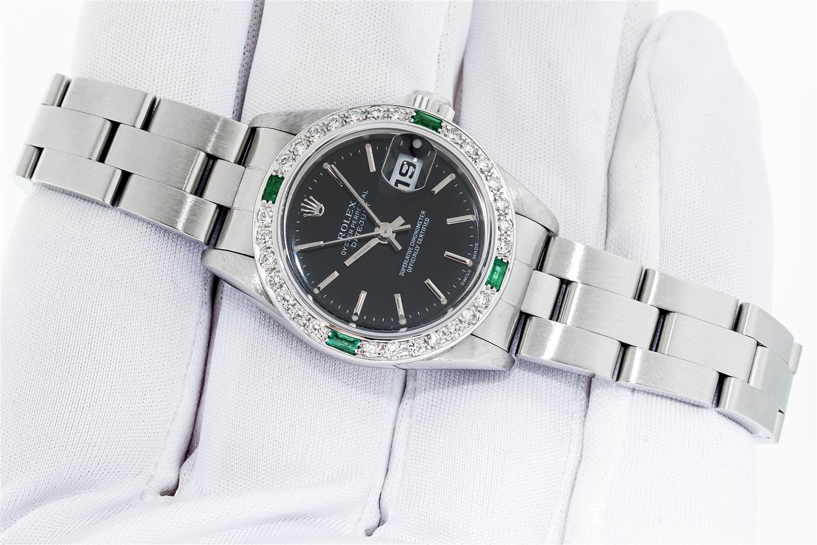 One Ladies Pre Owned Quickset Stainless Steel Rolex Datejust Polished Bright with Satin Finish, Serviced & Electronically Tested, Stainless Steel Case: 26mm, Rolex Stainless Steel Crown, Custom Bezel: New 18K White Gold Emerald Bead Set Diamond Bezel, Diamond + Gem Count: 28 Diamonds + 4 Emeralds. Custom Crystal: New Sapphire With Magnified Date Window. Custom Hands: New Luminescent Hands. Rolex Movement: Automatic Winding Movement 2235. Rolex Dial: Black With Index Hour Markers & Lumi Dots. Date Window: 3 O'Clock Position Date Display, Model: Quickset Datejust. Condition: G-6 Extra Fine. Rolex Bracelet: Stainless Steel Oyster Band. Bright Polish & Satin Finish. 6.0 Inch Length, Adjustable. Standard Clasp, With Rolex Logo. This Watch Has Been Serviced Time Tested And Is In Excellent Condition It Is Free Of All Scratches And Dents.