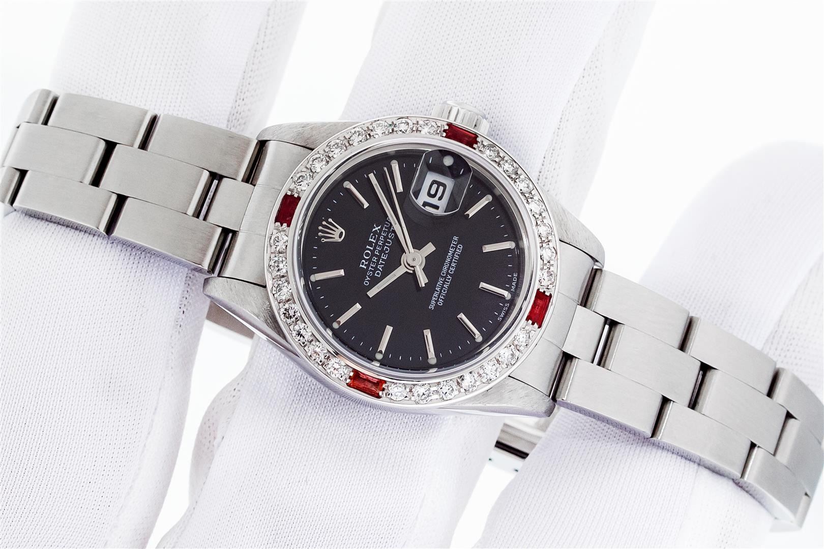 One Ladies Pre Owned Quickset Stainless Steel Rolex Datejust Polished Bright with Satin Finish, Serviced & Electronically Tested, Stainless Steel Case: 26mm, Rolex Stainless Steel Crown, Custom Bezel: New 18K White Gold Ruby Bead Set Diamond Bezel, Diamond + Gem Count: 28 Diamonds + 4 Rubies. Custom Crystal: New Sapphire With Magnified Date Window. Custom Hands: New Luminescent Hands. Rolex Movement: Automatic Winding Movement 2235. Rolex Dial: Black With Index Hour Markers & Lumi Dots. Date Window: 3 O'Clock Position Date Display, Model: Quickset Datejust. Condition: G-6 Extra Fine. Rolex Bracelet: Stainless Steel Oyster Band. Bright Polish & Satin Finish. 6.0 Inch Length, Adjustable. Standard Clasp, With Rolex Logo. This Watch Has Been Serviced Time Tested And Is In Excellent Condition It Is Free Of All Scratches And Dents.