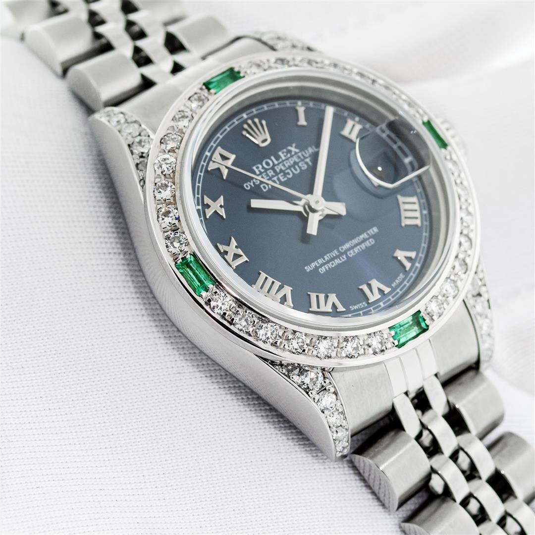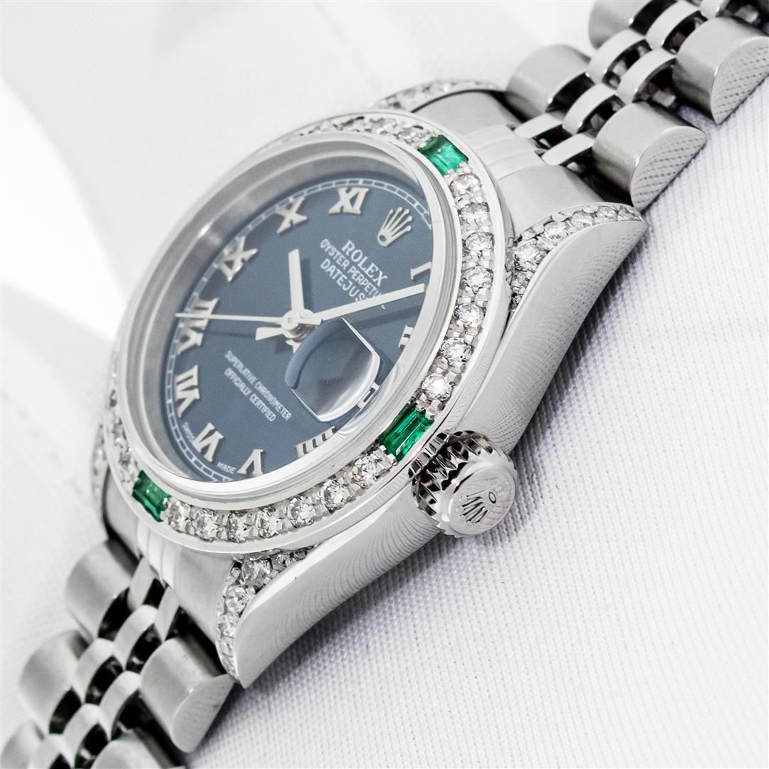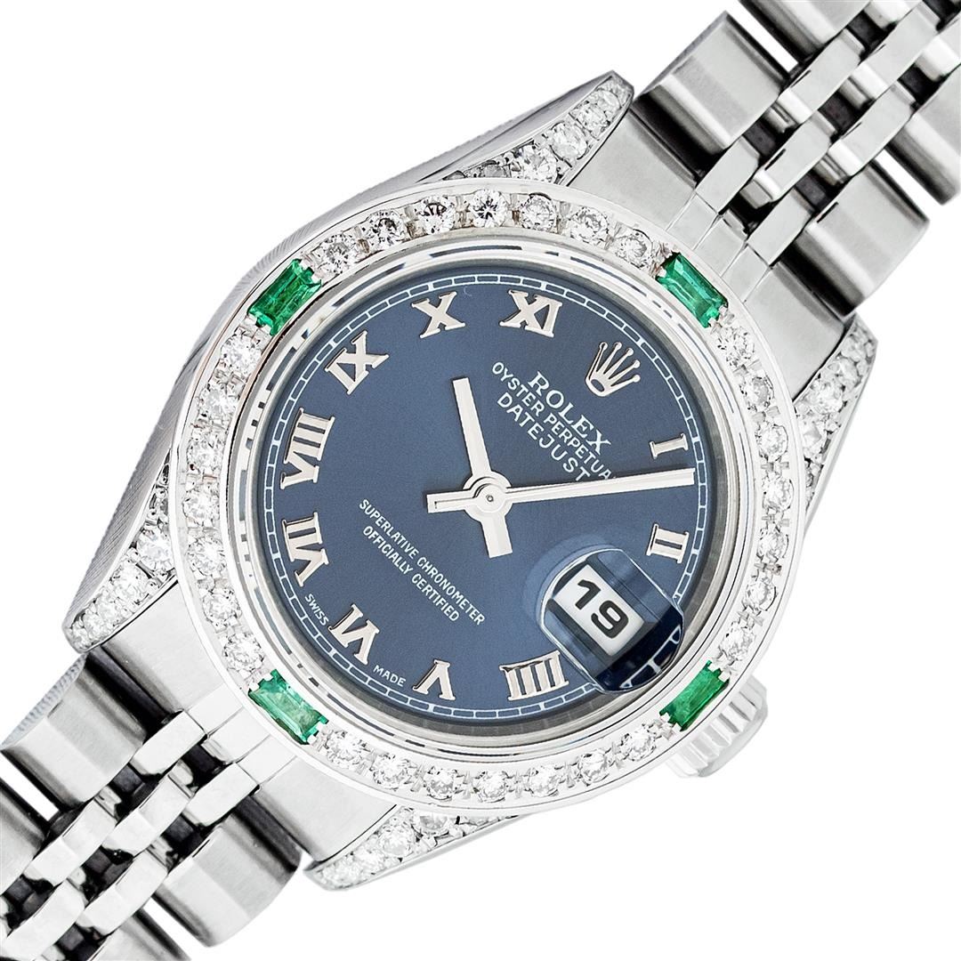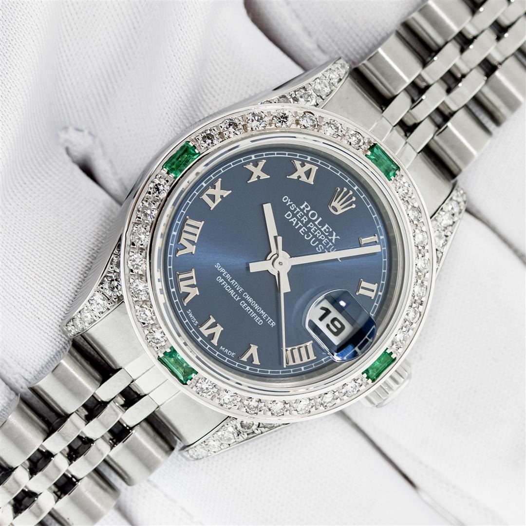 One Ladies Pre Owned Quickset Stainless Steel Rolex Datejust Polished Bright with Satin Finish, Serviced & Electronically Tested, Stainless Steel Case: 26mm, Custom Diamond Lugs: Added Diamonds On Lugs, Diamond Count: 24 Diamonds On Lugs. Rolex Stainless Steel Crown, Custom Bezel: New 18K White Gold Emerald Bead Set Diamond Bezel, Diamond + Gem Count: 28 Diamonds + 4 Emeralds. Custom Crystal: New Sapphire With Magnified Date Window. Custom Hands: New Hands. Rolex Movement: Automatic Winding Movement 2235. Rolex Dial: Blue With Roman Hour Markers & Square Track. Date Window: 3 O'Clock Position Date Display, Model: Quickset Datejust. Condition: G-6 Extra Fine. Rolex Bracelet: Stainless Steel Jubilee Band. Bright Polish & Satin Finish. 6.0 Inch Length, Adjustable. Standard Clasp, With Rolex Logo. This Watch Has Been Serviced Time Tested And Is In Excellent Condition It Is Free Of All Scratches And Dents.