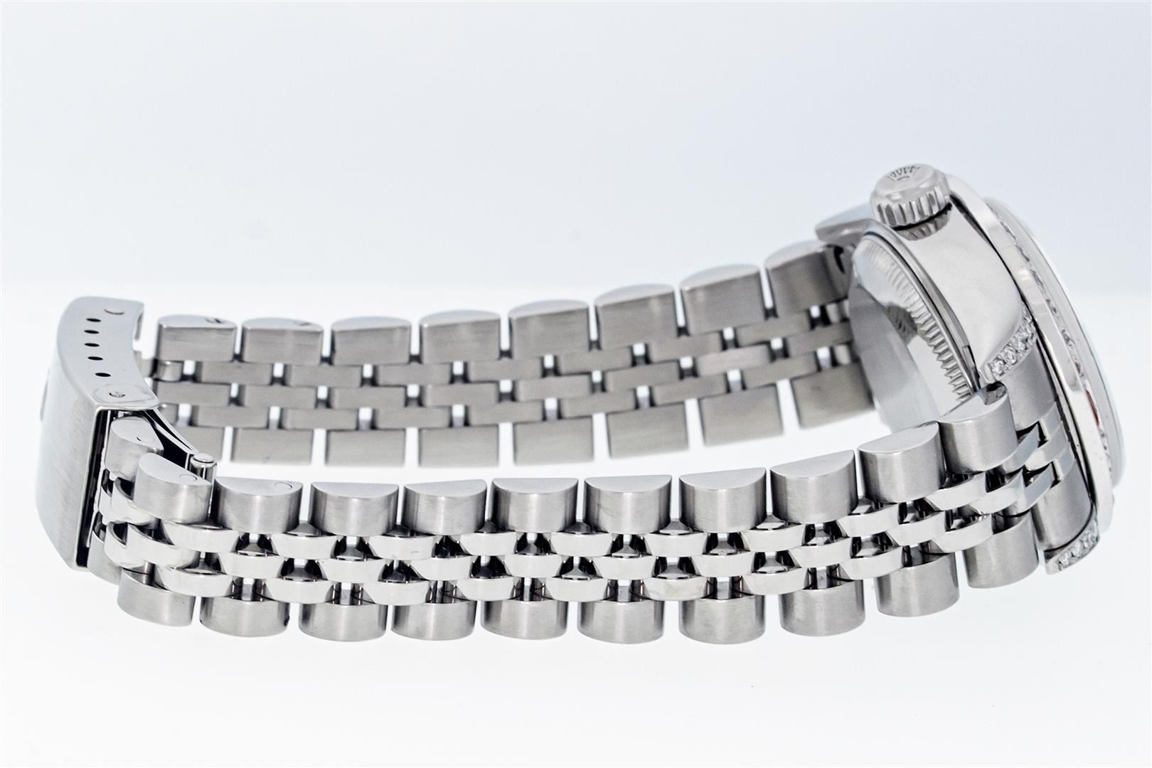 One Ladies Pre Owned Quickset Stainless Steel Rolex Datejust Polished Bright with Satin Finish, Serviced & Electronically Tested, Stainless Steel Case: 26mm, Custom Diamond Lugs: Added Diamonds On Lugs, Diamond Count: 24 Diamonds On Lugs. Rolex Stainless Steel Crown, Custom Bezel: New 18K White Gold Ruby Bead Set Diamond Bezel, Diamond + Gem Count: 28 Diamonds + 4 Rubies. Custom Crystal: New Sapphire With Magnified Date Window. Custom Hands: New Hands. Rolex Movement: Automatic Winding Movement 2235. Rolex Dial: Blue With Roman Hour Markers & Square Track. Date Window: 3 O'Clock Position Date Display, Model: Quickset Datejust. Condition: G-6 Extra Fine. Rolex Bracelet: Stainless Steel Jubilee Band. Bright Polish & Satin Finish. 6.0 Inch Length, Adjustable. Standard Clasp, With Rolex Logo. This Watch Has Been Serviced Time Tested And Is In Excellent Condition It Is Free Of All Scratches And Dents.