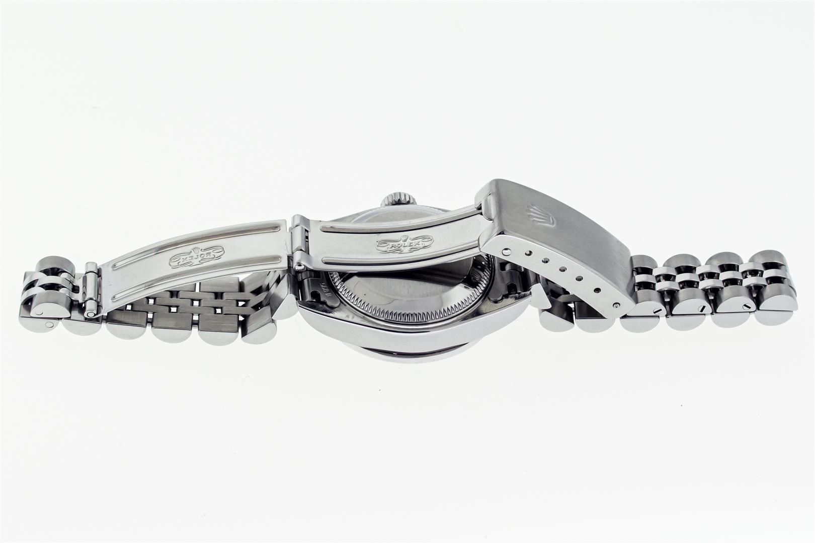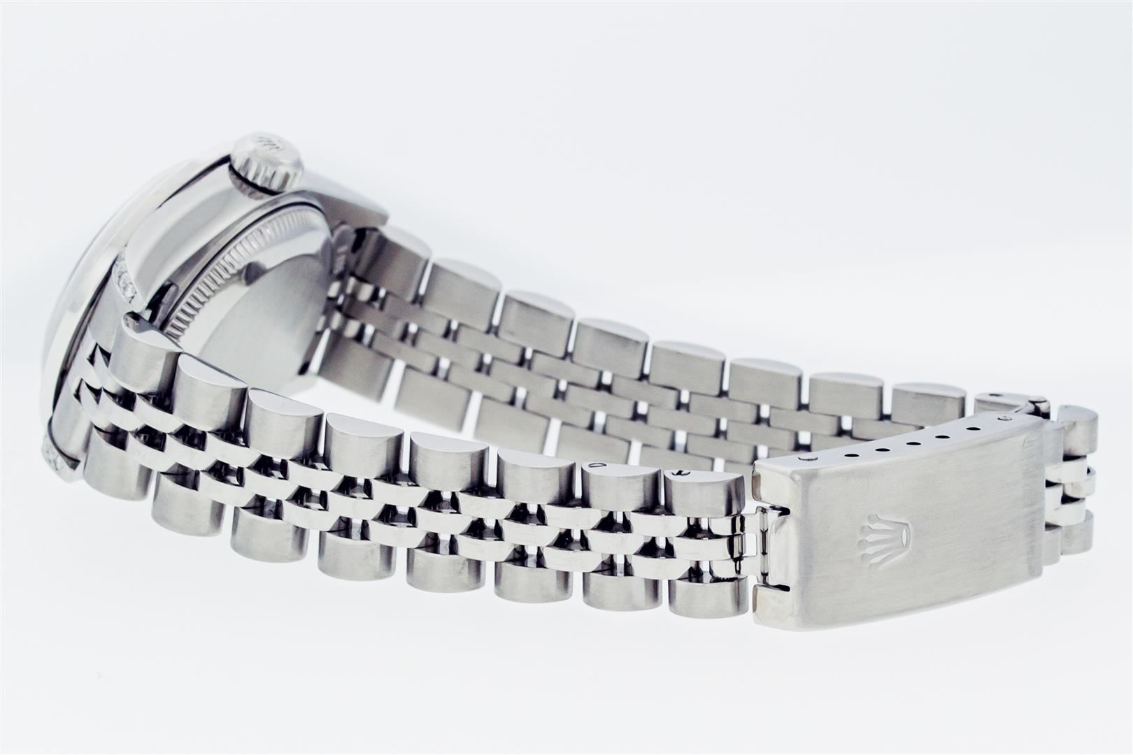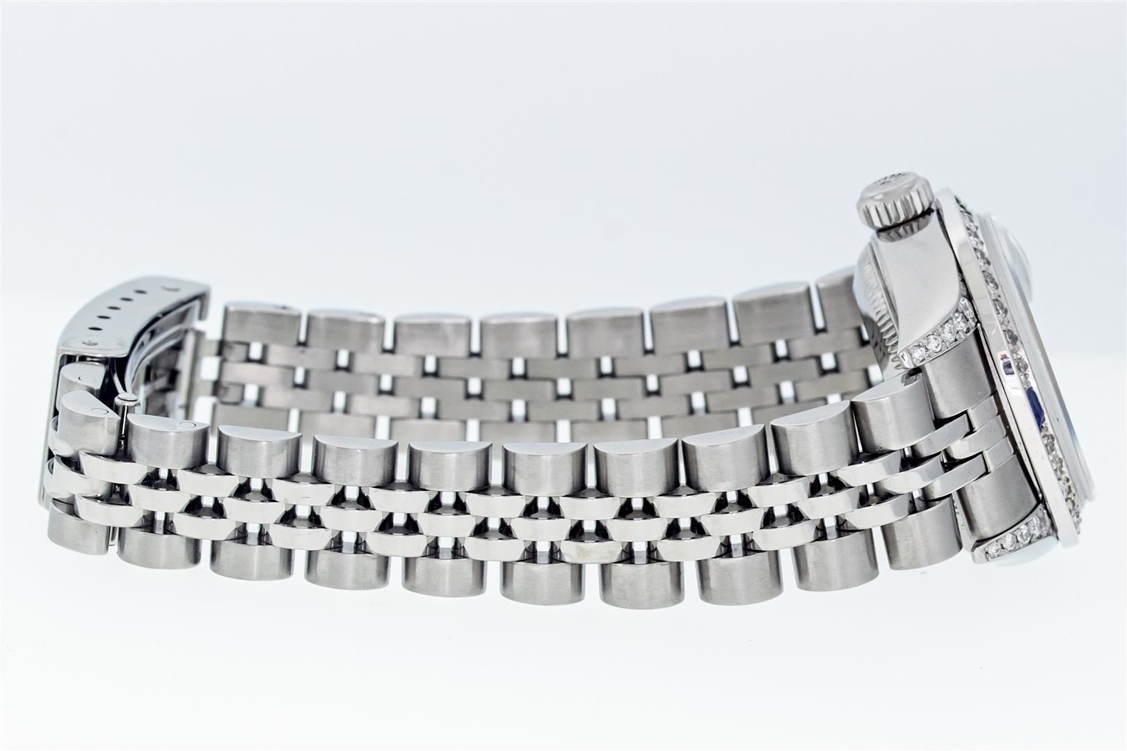 One Ladies Pre Owned Quickset Stainless Steel Rolex Datejust Polished Bright with Satin Finish, Serviced & Electronically Tested, Stainless Steel Case: 26mm, Custom Diamond Lugs: Added Diamonds On Lugs, Diamond Count: 24 Diamonds On Lugs. Rolex Stainless Steel Crown, Custom Bezel: New 18K White Gold Sapphire Bead Set Diamond Bezel, Diamond + Gem Count: 28 Diamonds + 4 Sapphires. Custom Crystal: New Sapphire With Magnified Date Window. Custom Hands: New Hands. Rolex Movement: Automatic Winding Movement 2235. Rolex Dial: Blue With Roman Hour Markers & Square Track. Date Window: 3 O'Clock Position Date Display, Model: Quickset Datejust. Condition: G-6 Extra Fine. Rolex Bracelet: Stainless Steel Jubilee Band. Bright Polish & Satin Finish. 6.0 Inch Length, Adjustable. Standard Clasp, With Rolex Logo. This Watch Has Been Serviced Time Tested And Is In Excellent Condition It Is Free Of All Scratches And Dents.