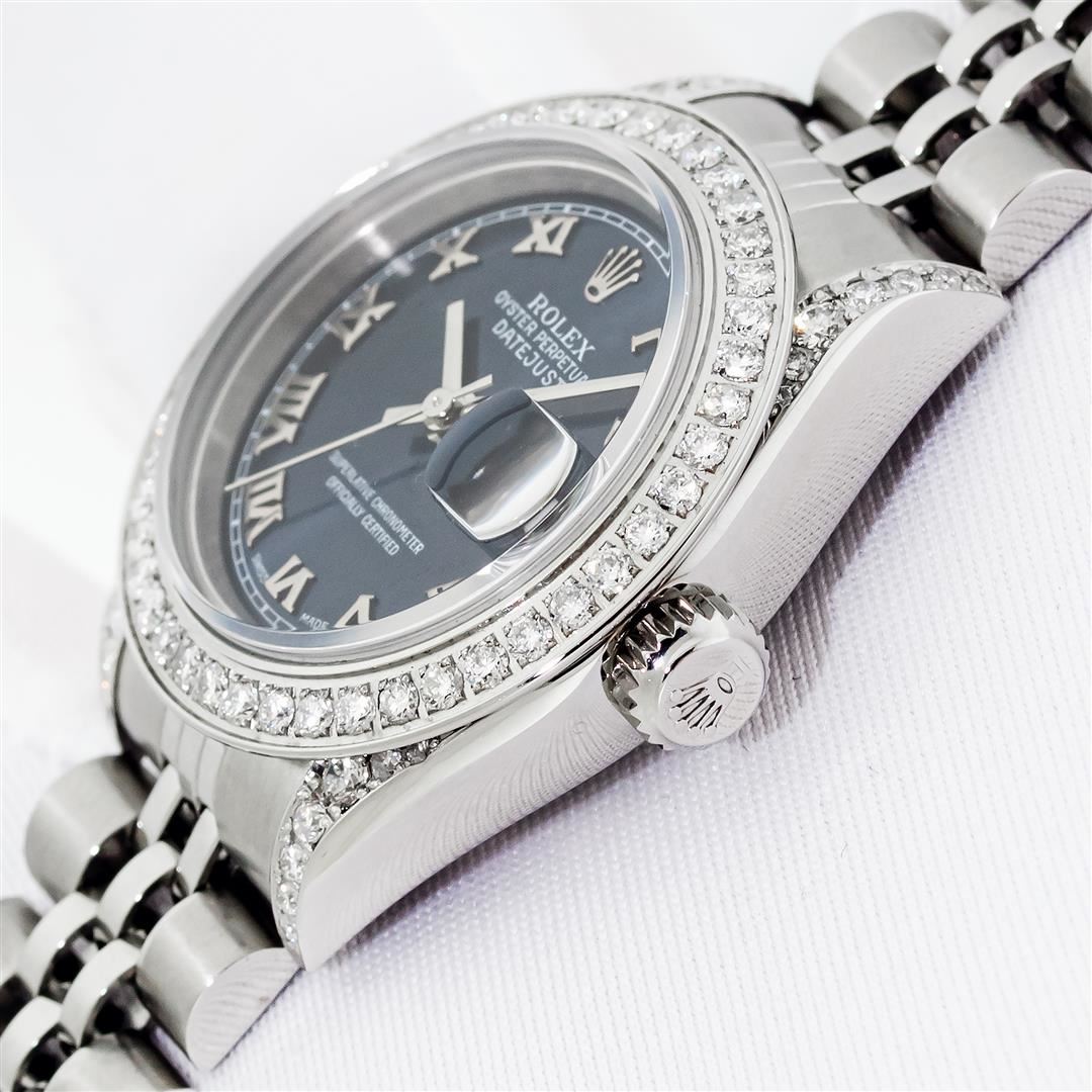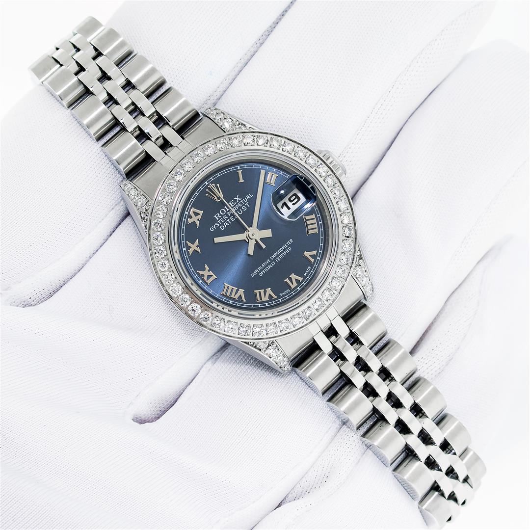 One Ladies Pre Owned Quickset Stainless Steel Rolex Datejust Polished Bright with Satin Finish, Serviced & Electronically Tested, Stainless Steel Case: 26mm, Custom Diamond Lugs: Added Diamonds On Lugs, Diamond Count: 24 Diamonds On Lugs. Rolex Stainless Steel Crown, Custom Bezel: New Stainless Steel Bead Set Diamond Bezel, Diamond Count: 40 Diamonds On Bezel. Custom Crystal: New Sapphire With Magnified Date Window. Custom Hands: New Hands. Rolex Movement: Automatic Winding Movement 2235. Rolex Dial: Blue With Roman Hour Markers & Square Track. Date Window: 3 O'Clock Position Date Display, Model: Quickset Datejust. Condition: G-6 Extra Fine. Rolex Bracelet: Stainless Steel Jubilee Band. Bright Polish & Satin Finish. 6.0 Inch Length, Adjustable. Standard Clasp, With Rolex Logo. This Watch Has Been Serviced Time Tested And Is In Excellent Condition It Is Free Of All Scratches And Dents.