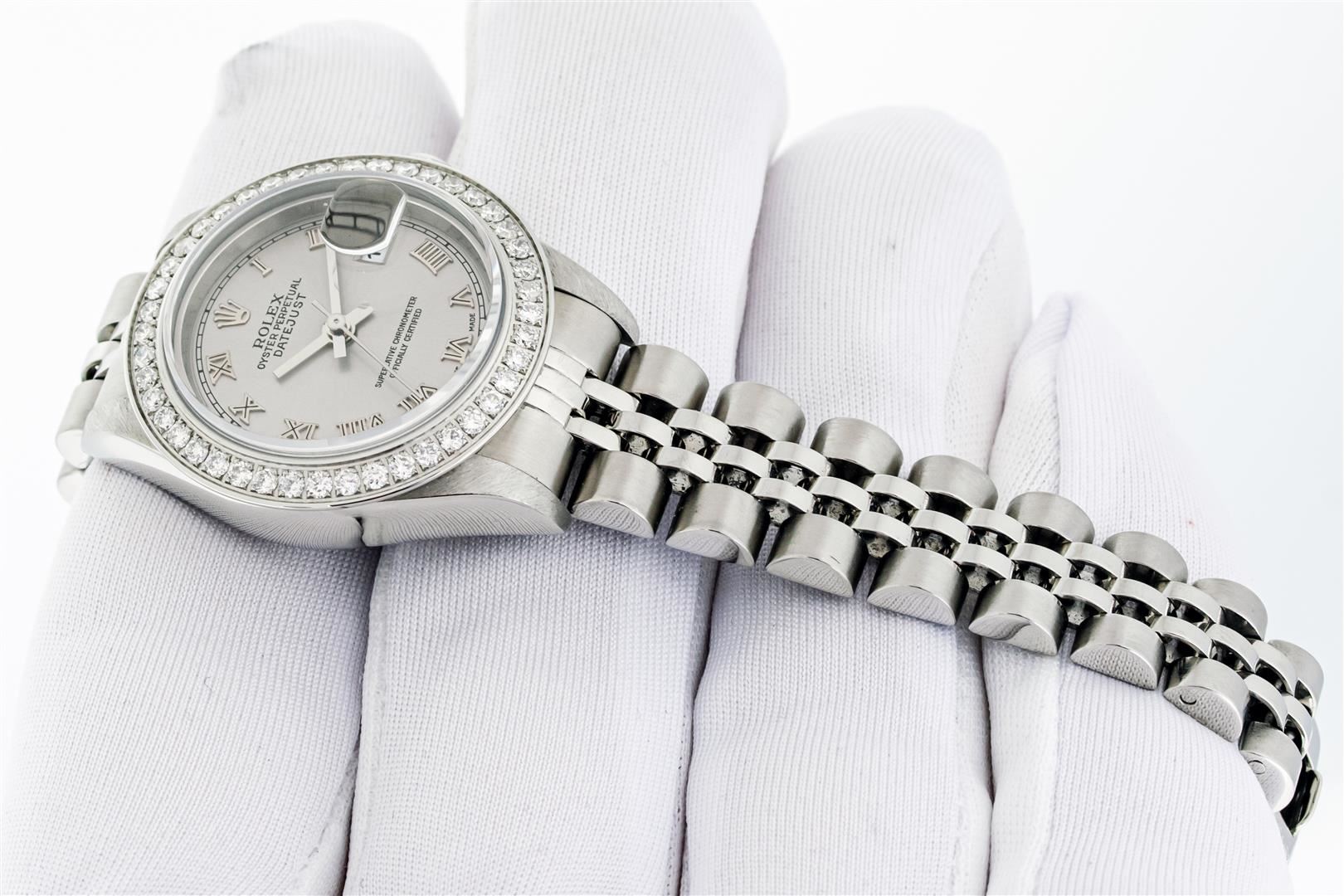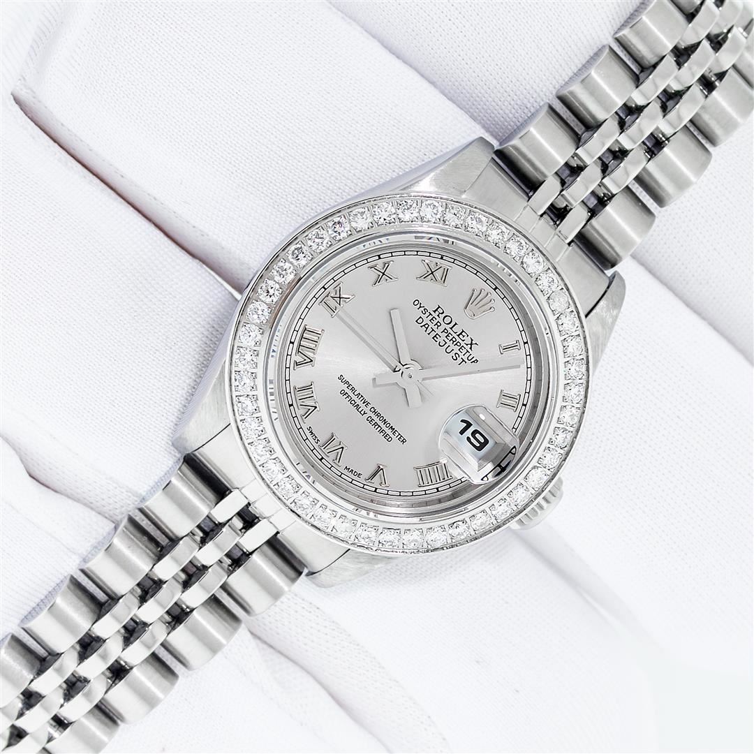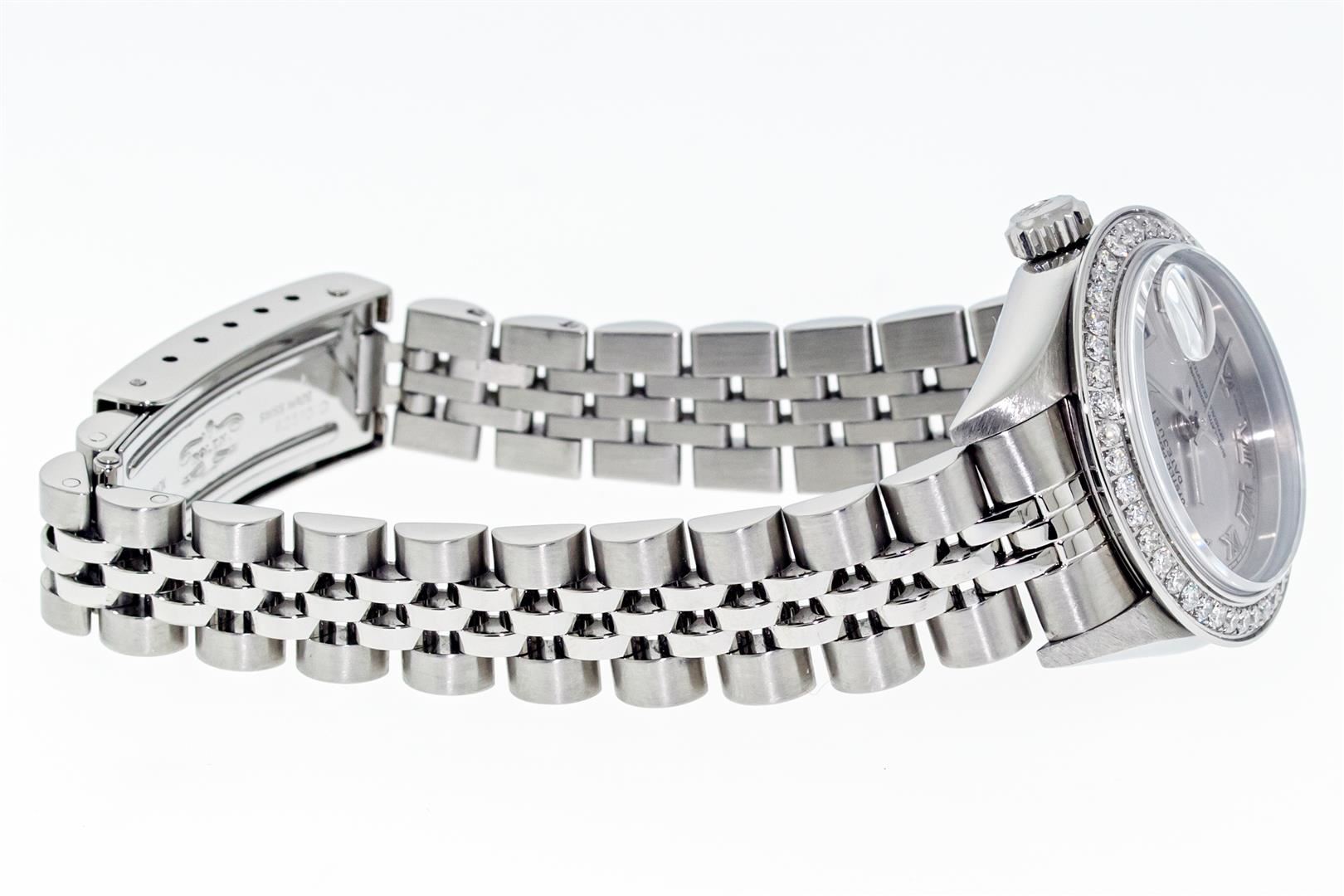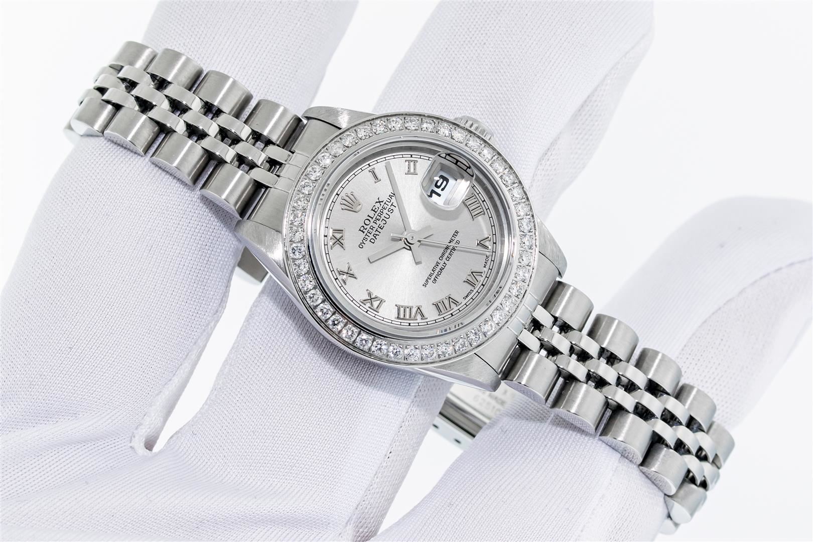 One Ladies Pre Owned Quickset Stainless Steel Rolex Datejust Polished Bright with Satin Finish, Serviced & Electronically Tested, Stainless Steel Case: 26mm. Rolex Stainless Steel Crown, Custom Bezel: New Stainless Steel Bead Set Diamond Bezel, Diamond Co