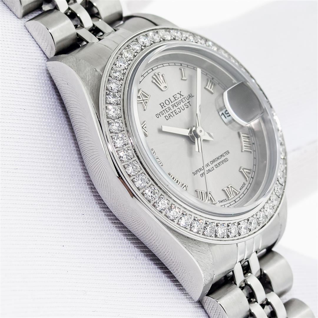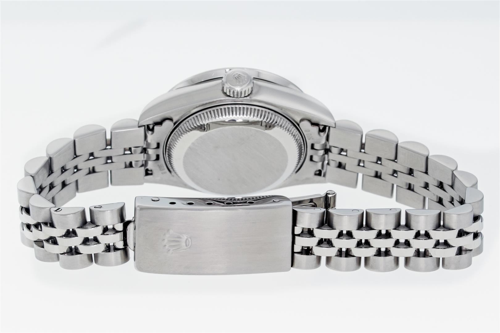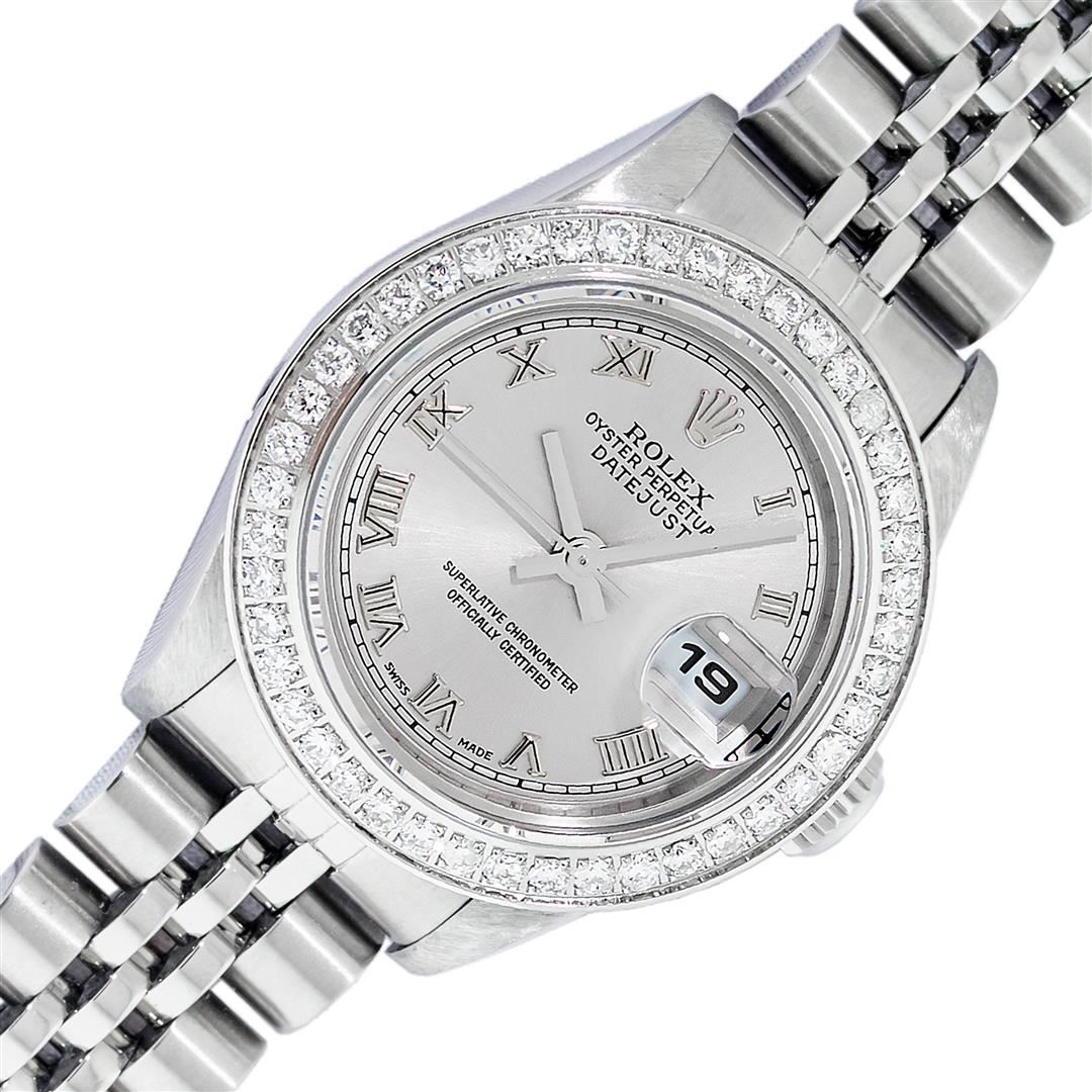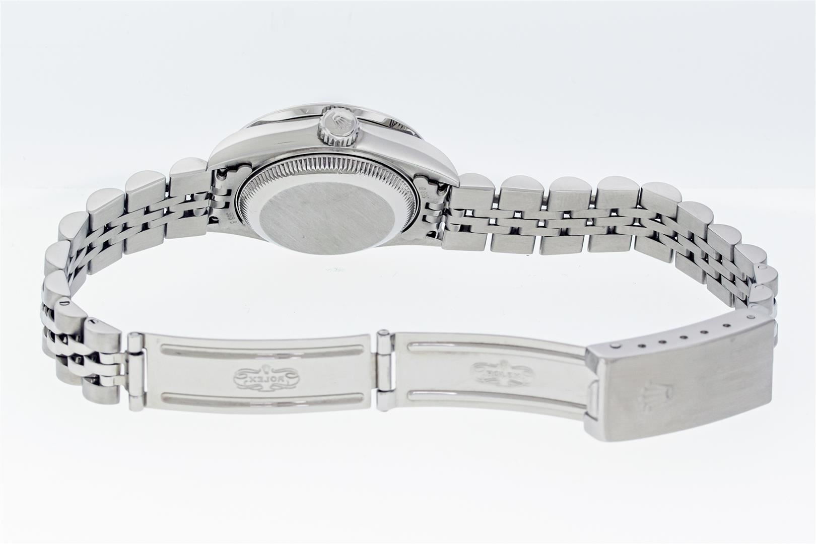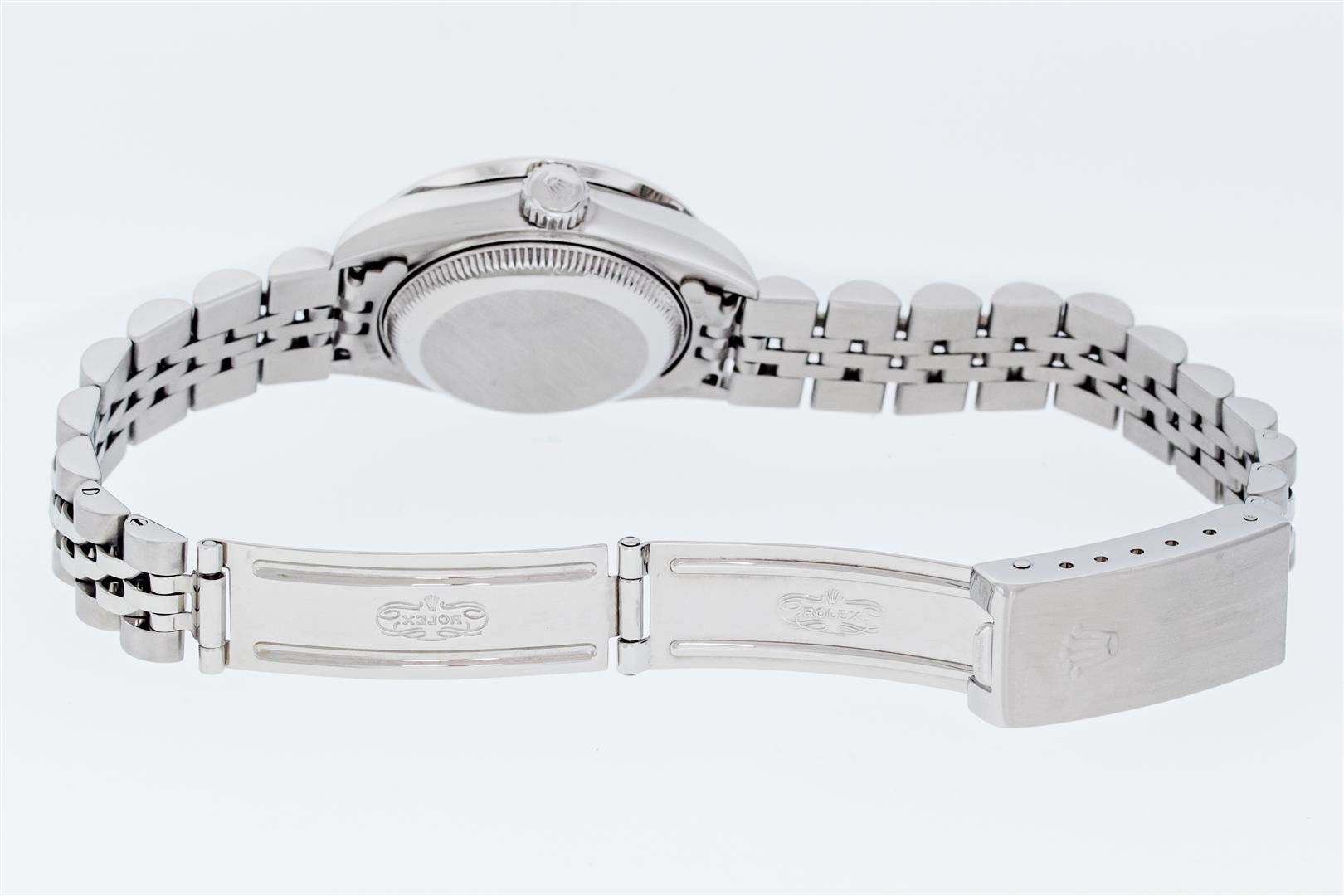 One Ladies Pre Owned Quickset Stainless Steel Rolex Datejust Polished Bright with Satin Finish, Serviced & Electronically Tested, Stainless Steel Case: 26mm. Rolex Stainless Steel Crown, Custom Bezel: New Stainless Steel Bead Set Diamond Bezel, Diamond Co