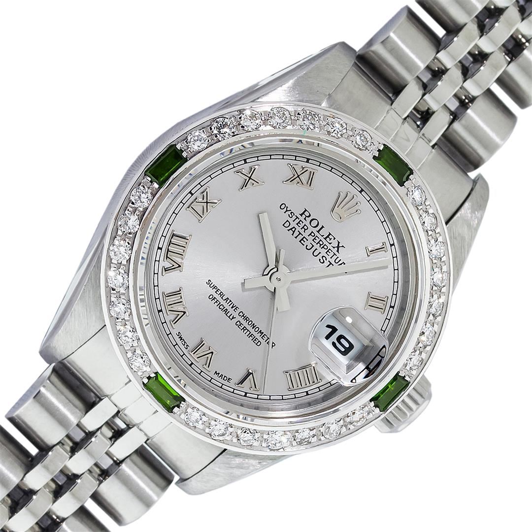 One Ladies Pre Owned Quickset Stainless Steel Rolex Datejust Polished Bright with Satin Finish, Serviced & Electronically Tested, Stainless Steel Case: 26mm. Rolex Stainless Steel Crown, Custom Bezel: New 18K White Gold Emerald Bead Set Diamond Bezel, Diamond + Gem Count: 28 Diamonds + 4 Emeralds. Custom Crystal: New Sapphire With Magnified Date Window. Custom Hands: New Hands. Rolex Movement: Automatic Winding Movement 2235. Rolex Dial: Gray With Roman Hour Markers & Square Track. Date Window: 3 O'Clock Position Date Display, Model: Quickset Datejust. Condition: G-6 Extra Fine. Rolex Bracelet: Stainless Steel Jubilee Band. Bright Polish & Satin Finish. 6.0 Inch Length, Adjustable. Standard Clasp, With Rolex Logo. This Watch Has Been Serviced Time Tested And Is In Excellent Condition It Is Free Of All Scratches And Dents.