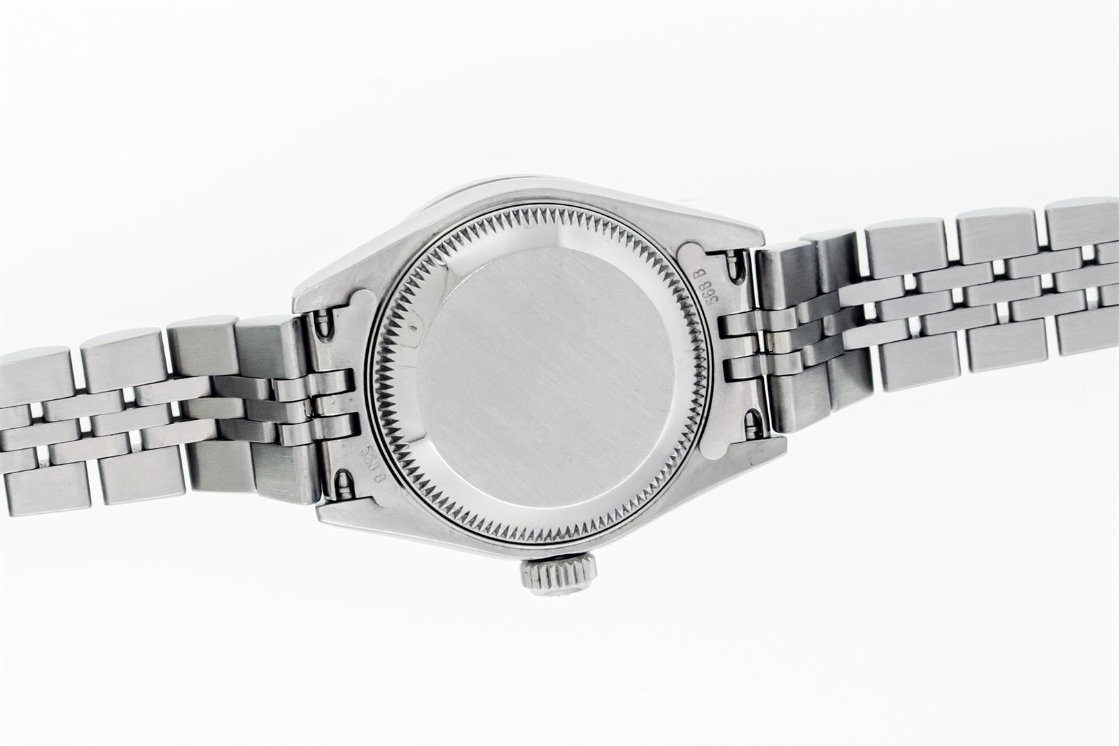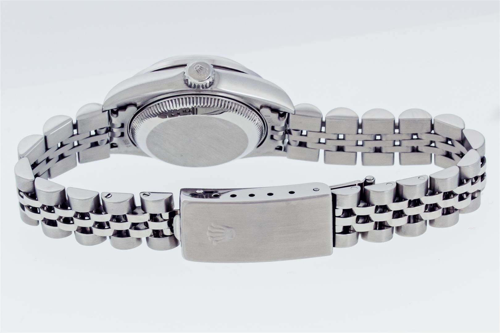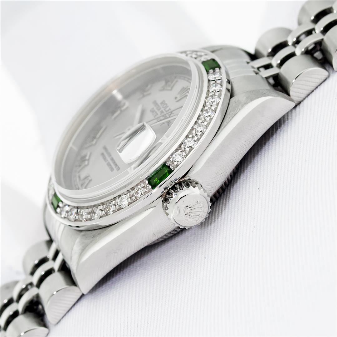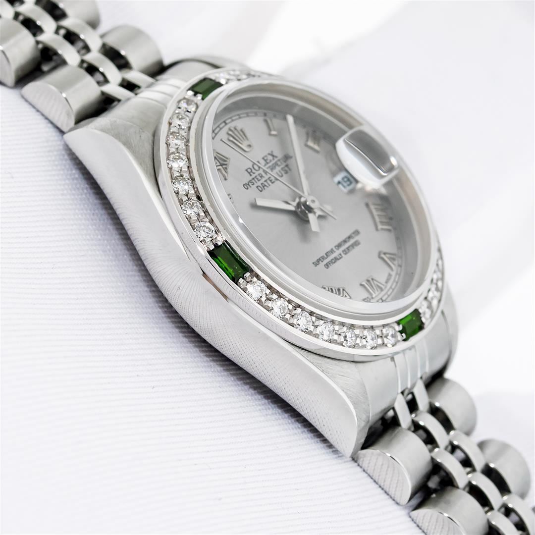 One Ladies Pre Owned Quickset Stainless Steel Rolex Datejust Polished Bright with Satin Finish, Serviced & Electronically Tested, Stainless Steel Case: 26mm. Rolex Stainless Steel Crown, Custom Bezel: New 18K White Gold Emerald Bead Set Diamond Bezel, Diamond + Gem Count: 28 Diamonds + 4 Emeralds. Custom Crystal: New Sapphire With Magnified Date Window. Custom Hands: New Hands. Rolex Movement: Automatic Winding Movement 2235. Rolex Dial: Gray With Roman Hour Markers & Square Track. Date Window: 3 O'Clock Position Date Display, Model: Quickset Datejust. Condition: G-6 Extra Fine. Rolex Bracelet: Stainless Steel Jubilee Band. Bright Polish & Satin Finish. 6.0 Inch Length, Adjustable. Standard Clasp, With Rolex Logo. This Watch Has Been Serviced Time Tested And Is In Excellent Condition It Is Free Of All Scratches And Dents.