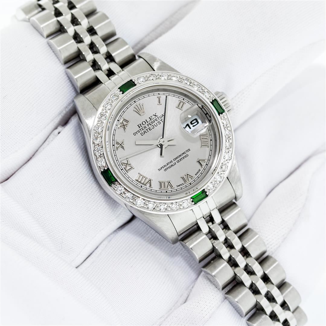 One Ladies Pre Owned Quickset Stainless Steel Rolex Datejust Polished Bright with Satin Finish, Serviced & Electronically Tested, Stainless Steel Case: 26mm. Rolex Stainless Steel Crown, Custom Bezel: New 18K White Gold Emerald Bead Set Diamond Bezel, Diamond + Gem Count: 28 Diamonds + 4 Emeralds. Custom Crystal: New Sapphire With Magnified Date Window. Custom Hands: New Hands. Rolex Movement: Automatic Winding Movement 2235. Rolex Dial: Gray With Roman Hour Markers & Square Track. Date Window: 3 O'Clock Position Date Display, Model: Quickset Datejust. Condition: G-6 Extra Fine. Rolex Bracelet: Stainless Steel Jubilee Band. Bright Polish & Satin Finish. 6.0 Inch Length, Adjustable. Standard Clasp, With Rolex Logo. This Watch Has Been Serviced Time Tested And Is In Excellent Condition It Is Free Of All Scratches And Dents.