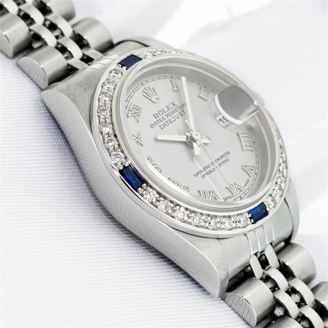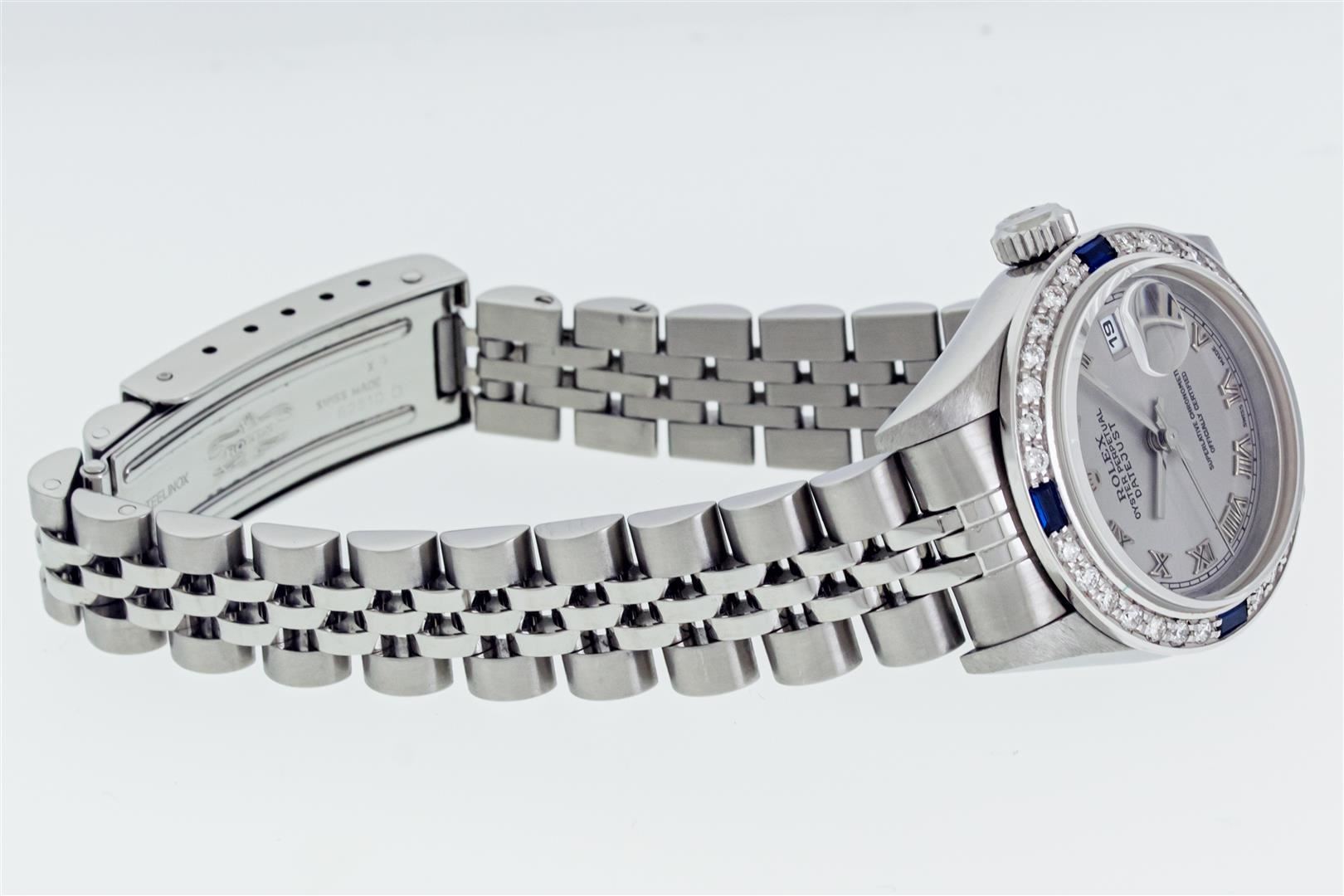 One Ladies Pre Owned Quickset Stainless Steel Rolex Datejust Polished Bright with Satin Finish, Serviced & Electronically Tested, Stainless Steel Case: 26mm. Rolex Stainless Steel Crown, Custom Bezel: New 18K White Gold Sapphire Bead Set Diamond Bezel, Diamond + Gem Count: 28 Diamonds + 4 Sapphires. Custom Crystal: New Sapphire With Magnified Date Window. Custom Hands: New Hands. Rolex Movement: Automatic Winding Movement 2235. Rolex Dial: Gray With Roman Hour Markers & Square Track. Date Window: 3 O'Clock Position Date Display, Model: Quickset Datejust. Condition: G-6 Extra Fine. Rolex Bracelet: Stainless Steel Jubilee Band. Bright Polish & Satin Finish. 6.0 Inch Length, Adjustable. Standard Clasp, With Rolex Logo. This Watch Has Been Serviced Time Tested And Is In Excellent Condition It Is Free Of All Scratches And Dents.