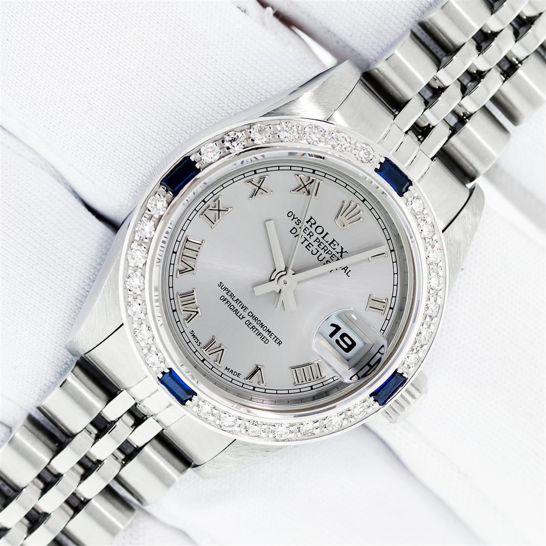 One Ladies Pre Owned Quickset Stainless Steel Rolex Datejust Polished Bright with Satin Finish, Serviced & Electronically Tested, Stainless Steel Case: 26mm. Rolex Stainless Steel Crown, Custom Bezel: New 18K White Gold Sapphire Bead Set Diamond Bezel, Diamond + Gem Count: 28 Diamonds + 4 Sapphires. Custom Crystal: New Sapphire With Magnified Date Window. Custom Hands: New Hands. Rolex Movement: Automatic Winding Movement 2235. Rolex Dial: Gray With Roman Hour Markers & Square Track. Date Window: 3 O'Clock Position Date Display, Model: Quickset Datejust. Condition: G-6 Extra Fine. Rolex Bracelet: Stainless Steel Jubilee Band. Bright Polish & Satin Finish. 6.0 Inch Length, Adjustable. Standard Clasp, With Rolex Logo. This Watch Has Been Serviced Time Tested And Is In Excellent Condition It Is Free Of All Scratches And Dents.