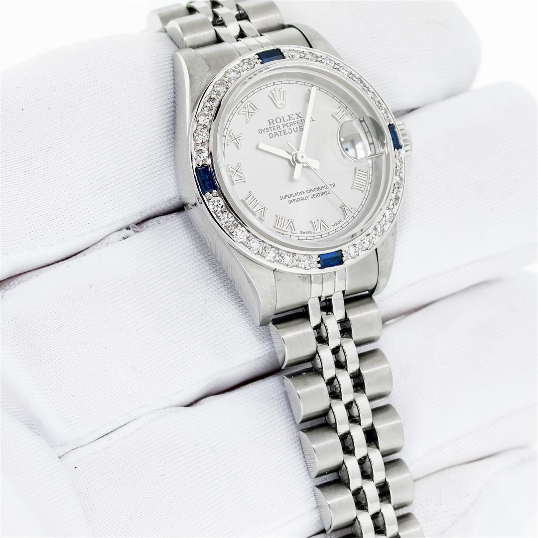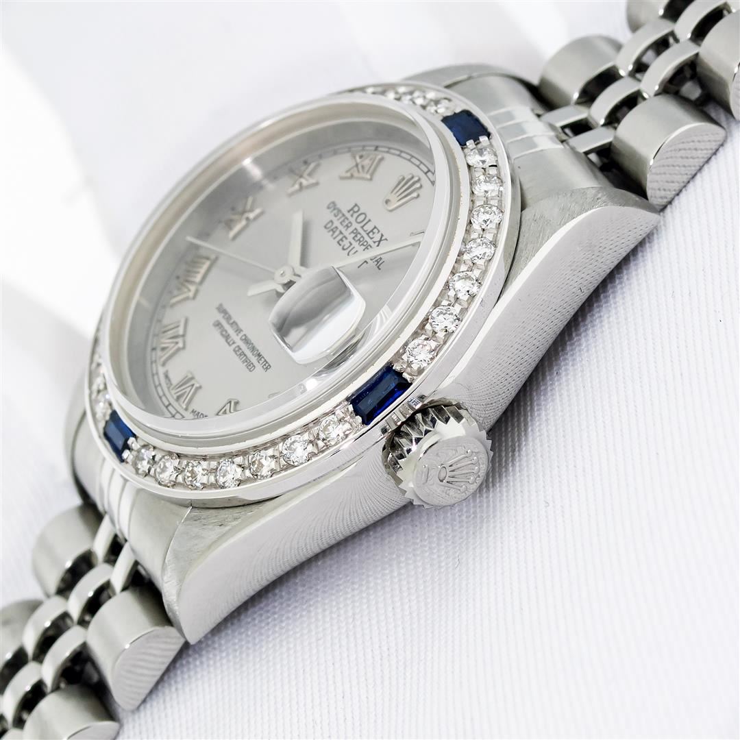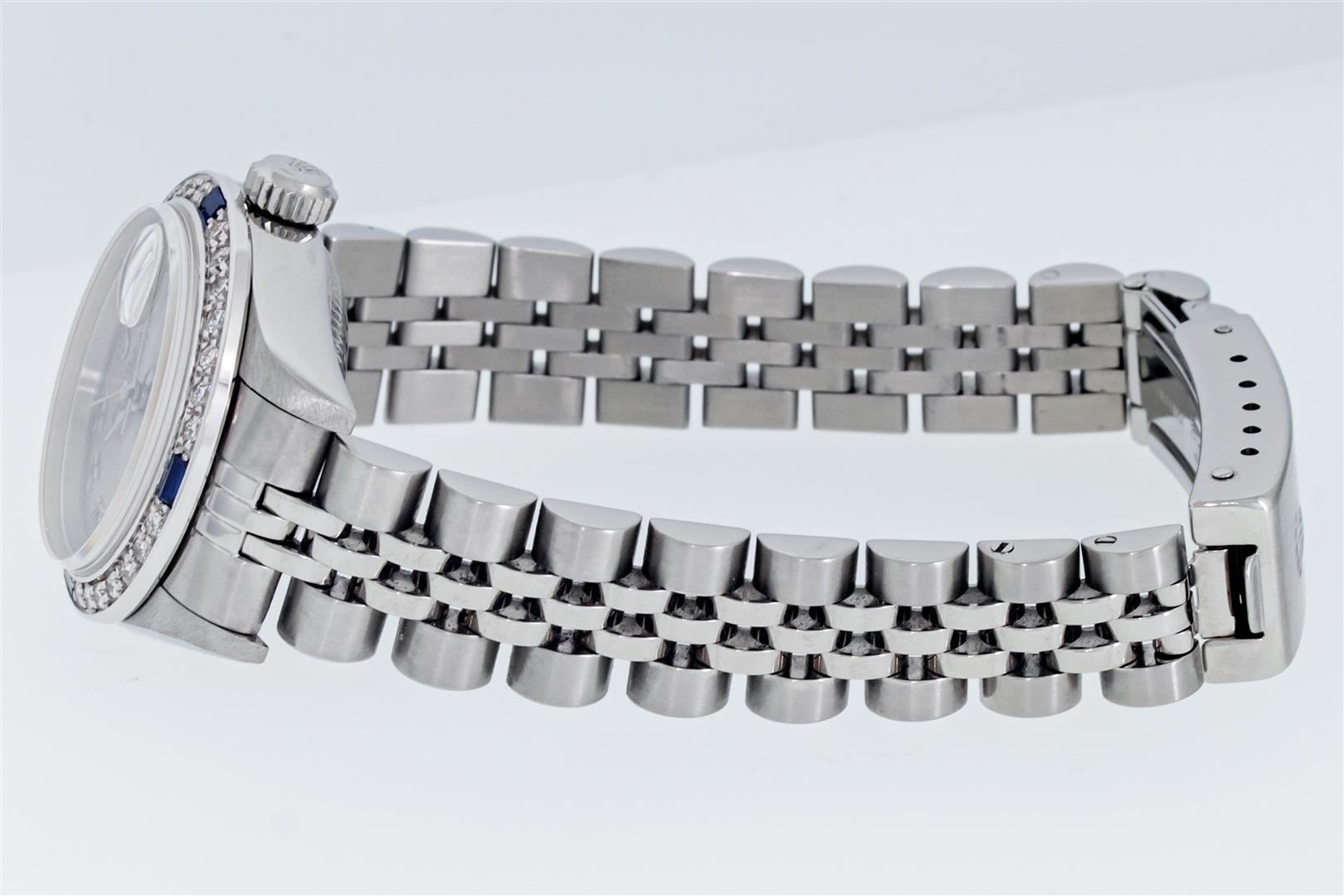 One Ladies Pre Owned Quickset Stainless Steel Rolex Datejust Polished Bright with Satin Finish, Serviced & Electronically Tested, Stainless Steel Case: 26mm. Rolex Stainless Steel Crown, Custom Bezel: New 18K White Gold Sapphire Bead Set Diamond Bezel, Diamond + Gem Count: 28 Diamonds + 4 Sapphires. Custom Crystal: New Sapphire With Magnified Date Window. Custom Hands: New Hands. Rolex Movement: Automatic Winding Movement 2235. Rolex Dial: Gray With Roman Hour Markers & Square Track. Date Window: 3 O'Clock Position Date Display, Model: Quickset Datejust. Condition: G-6 Extra Fine. Rolex Bracelet: Stainless Steel Jubilee Band. Bright Polish & Satin Finish. 6.0 Inch Length, Adjustable. Standard Clasp, With Rolex Logo. This Watch Has Been Serviced Time Tested And Is In Excellent Condition It Is Free Of All Scratches And Dents.