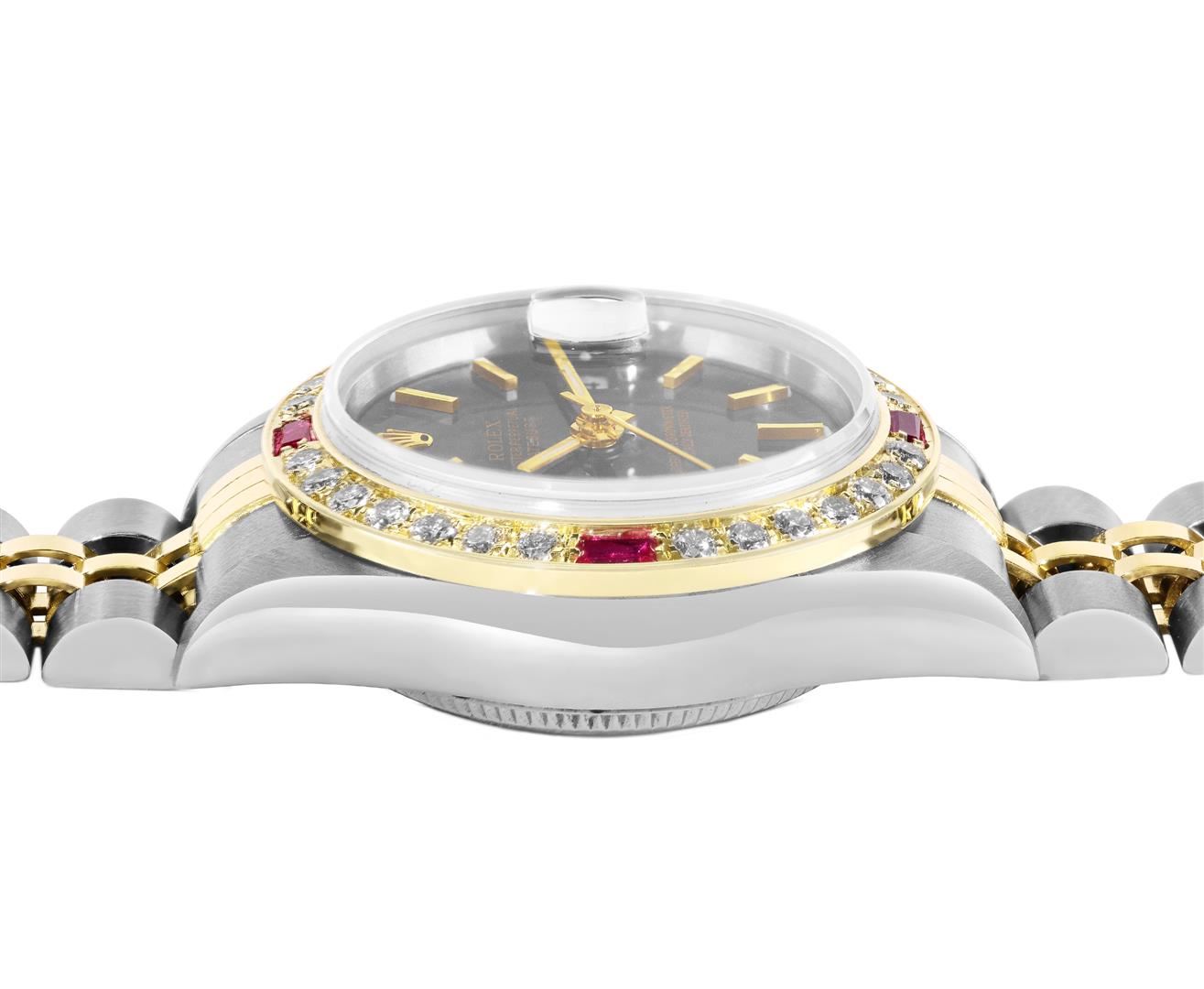 Rolex Ladies Pre Owned Quickset 18K Yellow Gold and Stainless Steel Two Tone Wristwatch Polished Bright with Satin Finish, Serviced & Electronically Tested, Rolex Case: 26mm, Rolex Yellow Gold Crown, Custom Bezel: New 18K Yellow Gold Beadset And Ruby Diam