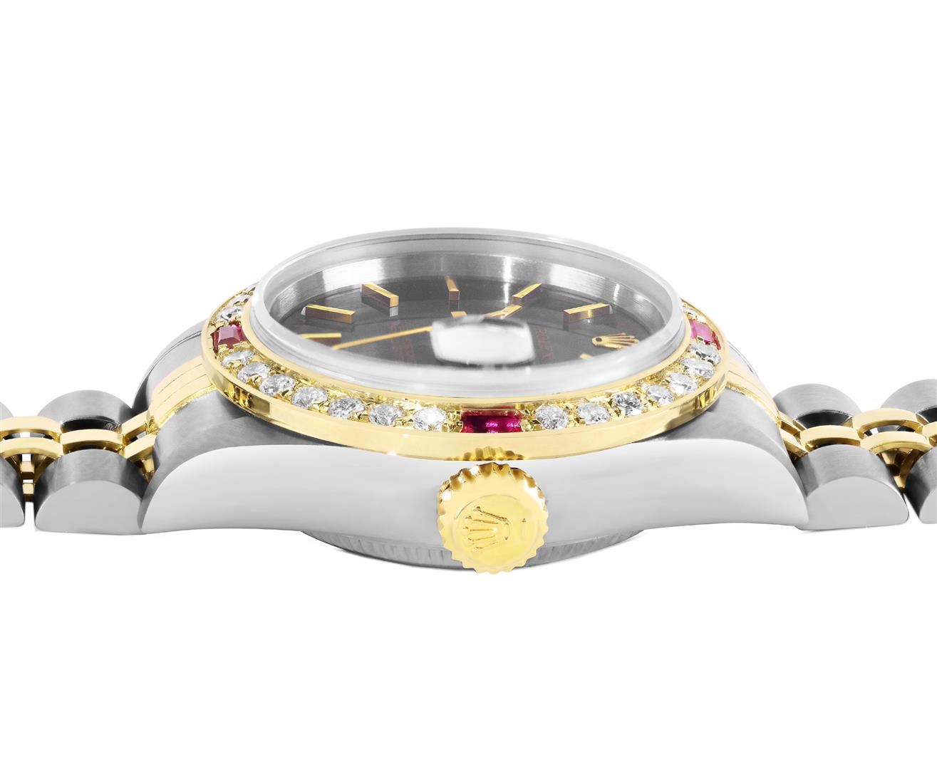 Rolex Ladies Pre Owned Quickset 18K Yellow Gold and Stainless Steel Two Tone Wristwatch Polished Bright with Satin Finish, Serviced & Electronically Tested, Rolex Case: 26mm, Rolex Yellow Gold Crown, Custom Bezel: New 18K Yellow Gold Beadset And Ruby Diamond Bezel, Stone Count: 28 Diamonds + 4 Rubies On Bezel. Crystal: Sapphire With Magnified Date Window. Hands: Luminicent Hands. Rolex Movement: 2235 Automatic Winding Movement. Rolex Dial: Black Dial With Dash Track & Lumi Dots, Date Window: 3 O'Clock Position Date Display, Model: Quickset Sapphire Datejust, Condition: G-6 Extra Fine. Rolex Bracelet: Stainless Steel and 18K Yellow Gold Jubilee Band. Bright Polish & Satin Finish. 6.0 Inch Length, Adjustable. Standard Clasp, With Rolex Logo. This Watch Has Been Serviced Time Tested And Is In Excellent Condition It Is Free Of All Scratches And Dents.