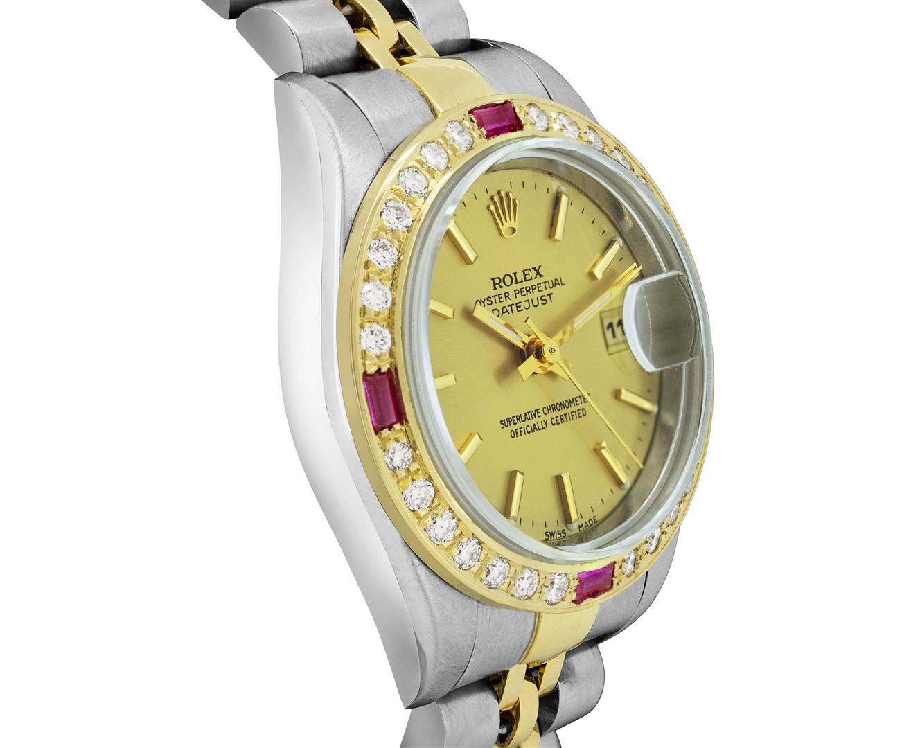One Rolex Ladies Pre Owned Two Tone 18K Yellow Gold & Stainless Steel Rolex Datejust Polished, Serviced & Electronically Tested, Rolex Yellow Gold & Stainless Steel Case: 26mm, Rolex Yellow Gold Crown, Custom Bezel: New 18K Yellow Gold Ruby Beadset Diamond Bezel, Diamond + Gem Count: 36 Diamonds + 4 Rubies, Clarity: SI-VS, Color: G to H. Custom Crystal: New Sapphire With Magnifying Date Window. Hands: Luminescent Hands. Rolex Movement: 2235 Automatic Winding Quickset Movement. Rolex Factory Dial: Champagne Dial With Index Hour Markers, Dash Track, and Lumi Dots. Date Window: 3 O'Clock Position Date Display, Condition: G-6 Extra Fine. Rolex Bracelet: Two Tone 18K Yellow Gold & Stainless Steel Jubilee Band. Bright Polish & Satin Finish. 6.0 Inch Length, Adjustable. Fold Clasp, With Rolex Logo. This Watch Has Been Serviced And Time Tested. It Is In Excellent Condition, Free Of All Scratches And Dents. This Watch Comes With A Rolex Box.