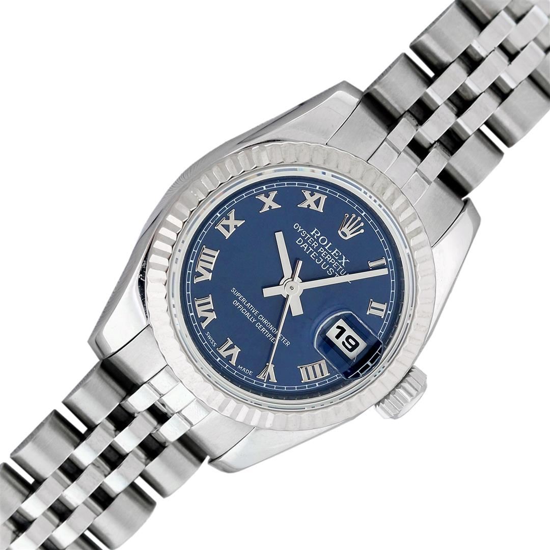 One Ladies Pre Owned Quickset Sapphire Stainless Steel Rolex Datejust Polished Bright with Satin Finish, Serviced & Electronically Tested, Rolex Stainless Steel Case: 26mm, Rolex Stainless Steel Crown, Rolex Bezel: 18K White Gold Fluted Bezel. Crystal: Sapphire With Magnified Date Window. Hands: Luminescent Hands. Rolex Movement: Automatic Winding Movement 2235. Rolex Dial: Blue With Roman Hour Markers With Square Track. Date Window: 3 O'Clock Position Date Display, Model: Sapphire Quickset Datejust. Condition: G-6 Extra Fine. Rolex Bracelet: Stainless Steel Jubilee Band. Bright Polish & Satin Finish. 6.0 Inch Length, Adjustable. Hidden Clap, With Rolex Logo. This Watch Has Been Serviced Time Tested And Is In Excellent Condition It Is Free Of All Scratches And Dents.