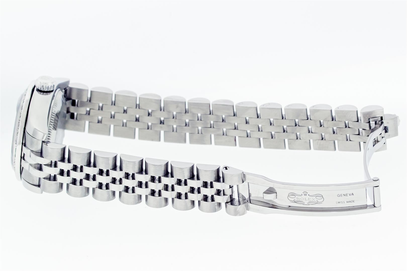 One Ladies Pre Owned Sapphire Quickset Stainless Steel Rolex Datejust Polished Bright with Satin Finish, Serviced & Electronically Tested, Rolex Stainless Steel Case: 26mm, Rolex Stainless Steel Crown, Custom Bezel: New 18K White Gold Diamond & Ruby Bezel, Stone Count: 28 Diamonds + 4 Rubies. Crystal: Sapphire With Magnified Date Window. Hands: Luminescent Hands. Rolex Movement: Automatic Winding Movement 2235. Rolex Dial: Blue Roman With Square Track. Date Window: 3 O'Clock Position Date Display, Model: Quickset Datejust. Condition: G-6 Extra Fine. Rolex Bracelet: Stainless Steel Jubilee Band. Bright Polish & Satin Finish. 6.0 Inch Length, Adjustable. Hidden Clap, With Rolex Logo. This Watch Has Been Serviced Time Tested And Is In Excellent Condition It Is Free Of All Scratches And Dents.