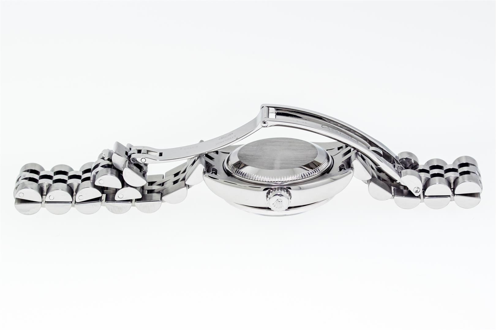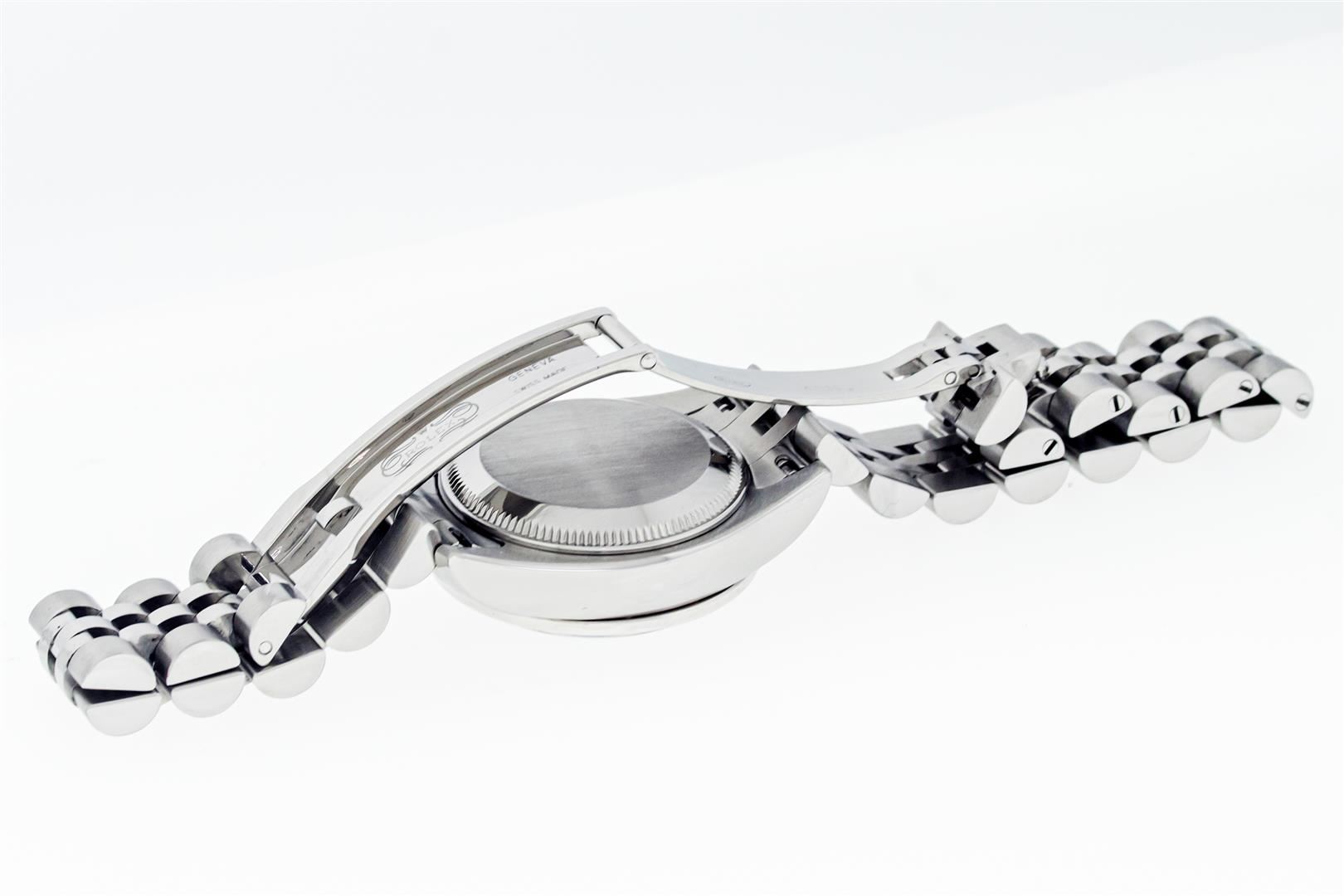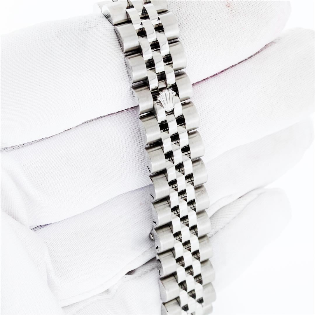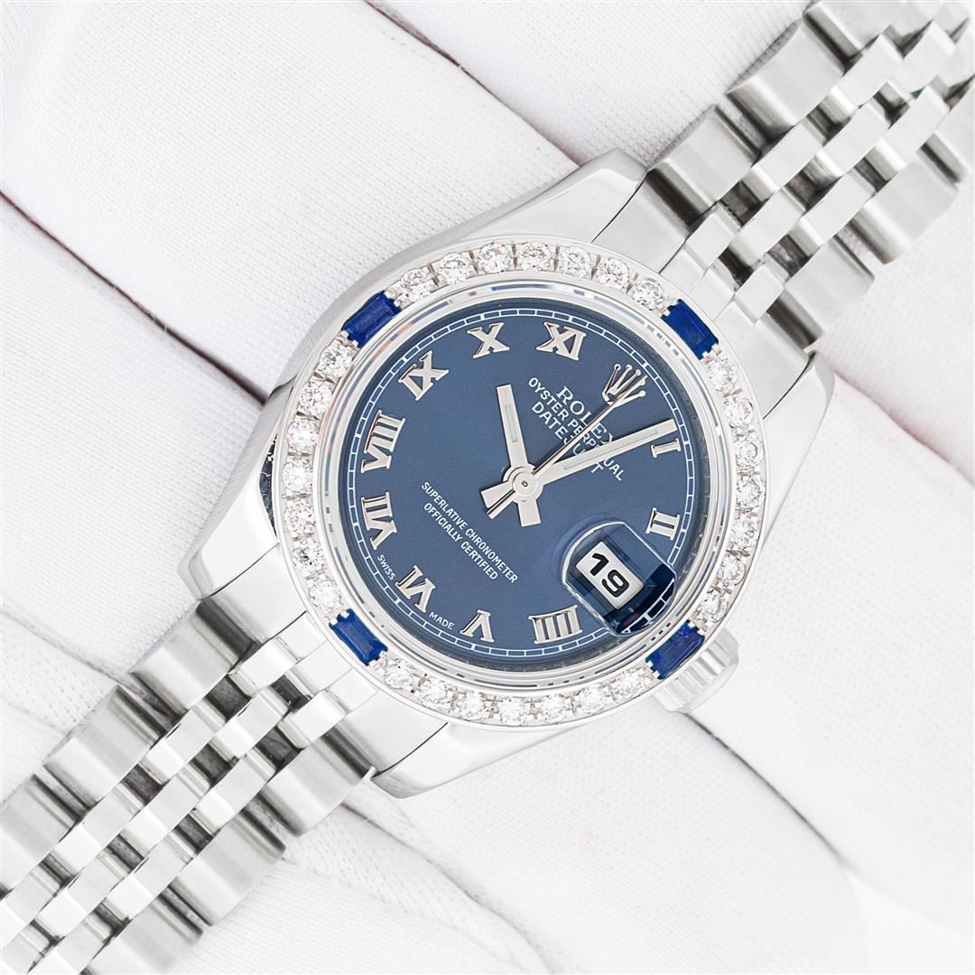One Ladies Pre Owned Sapphire Quickset Stainless Steel Rolex Datejust Polished Bright with Satin Finish, Serviced & Electronically Tested, Rolex Stainless Steel Case: 26mm, Rolex Stainless Steel Crown, Custom Bezel: New 18K White Gold Diamond & Sapphire Bezel, Stone Count: 28 Diamonds + 4 Sapphires. Crystal: Sapphire With Magnified Date Window. Hands: Luminescent Hands. Rolex Movement: Automatic Winding Movement 2235. Rolex Dial: Blue Roman With Square Track. Date Window: 3 O'Clock Position Date Display, Model: Quickset Datejust. Condition: G-6 Extra Fine. Rolex Bracelet: Stainless Steel Jubilee Band. Bright Polish & Satin Finish. 6.0 Inch Length, Adjustable. Hidden Clap, With Rolex Logo. This Watch Has Been Serviced Time Tested And Is In Excellent Condition It Is Free Of All Scratches And Dents.