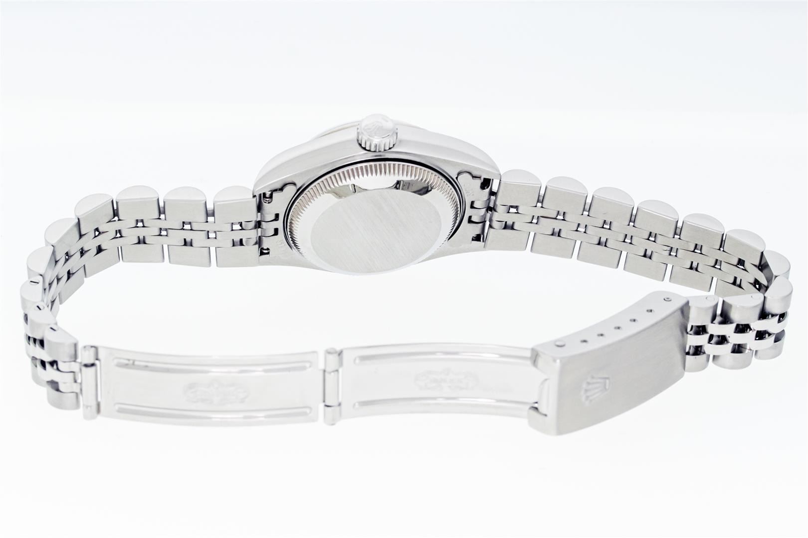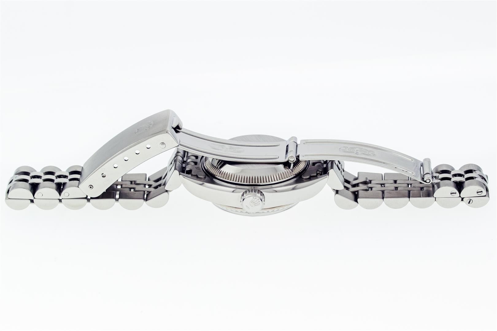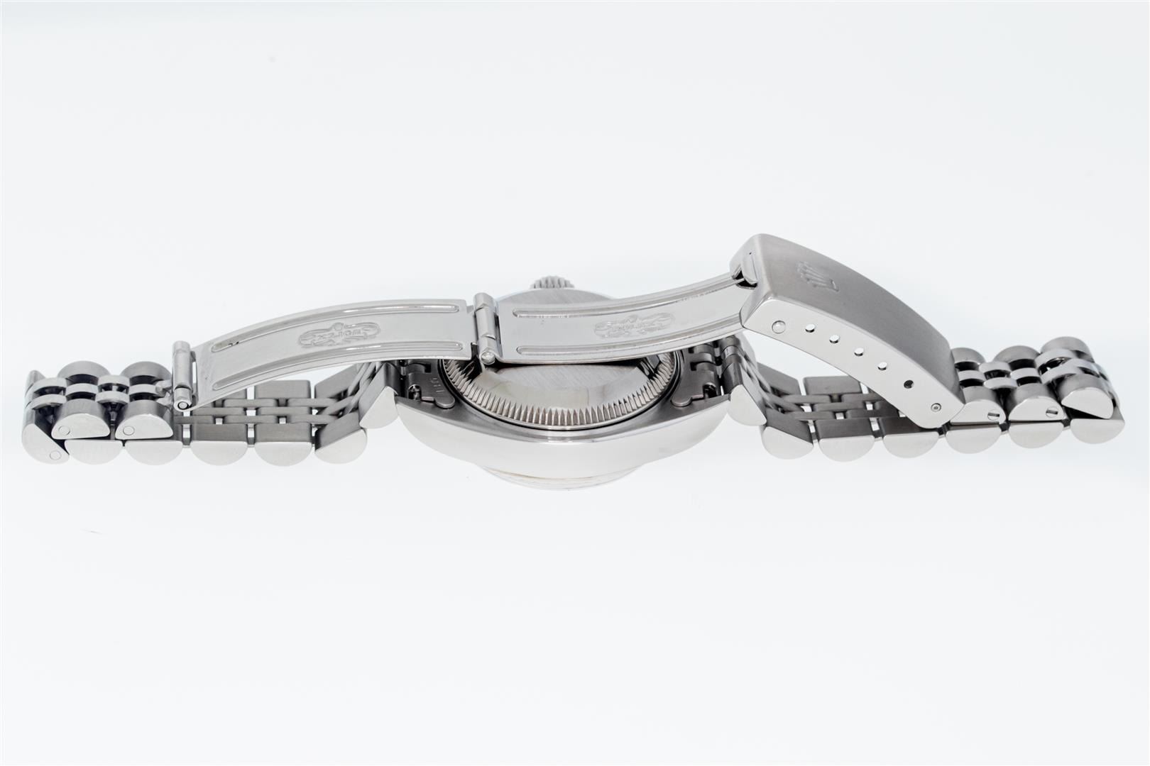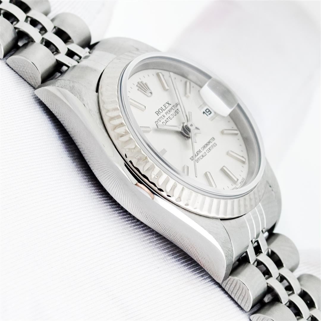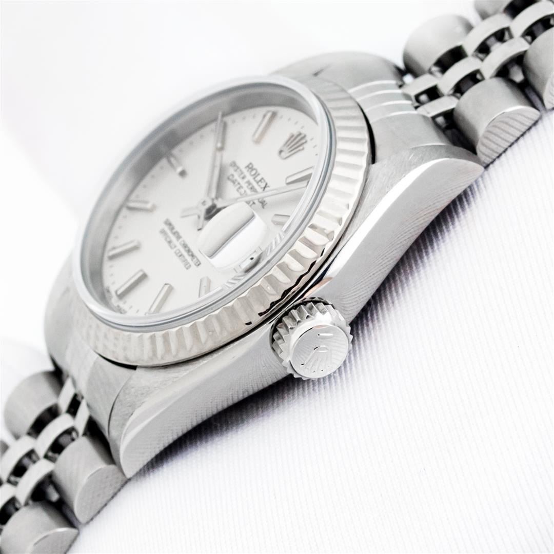 One Ladies Pre Owned Quickset Stainless Steel Rolex Datejust Polished Bright with Satin Finish, Serviced & Electronically Tested, Stainless Steel Case: 26mm, Rolex Stainless Steel Crown, Rolex Bezel: 18K White Gold Fluted Bezel. Crystal: Sapphire With Magnified Date Window. Custom Hands: Luminescent Hands. Rolex Movement: Automatic Winding Movement 2235. Rolex Dial: Silver Index With Dash Track & Lumi Dots. Date Window: 3 O'Clock Position Date Display, Model: Quickset Datejust. Condition: G-6 Extra Fine. Rolex Bracelet: Stainless Steel Jubilee Band. Bright Polish & Satin Finish. 6.0 Inch Length, Adjustable. Standard Clasp, With Rolex Logo. This Watch Has Been Serviced Time Tested And Is In Excellent Condition It Is Free Of All Scratches And Dents.