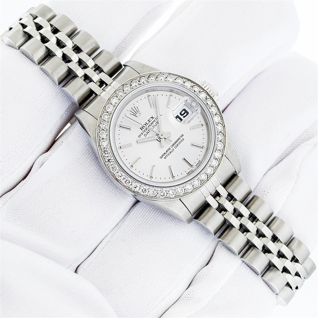 One Ladies Pre Owned Stainless Steel Rolex Datejust Polished Bright with Satin Finish, Serviced & Electronically Tested, Stainless Steel Case: 26mm, Rolex Stainless Steel Crown, Custom Bezel: New Stainless Steel Diamond Bezel, Diamond Count: 40 Diamonds On Bezel. Custom Crystal: New Sapphire With Magnified Date Window. Custom Hands: New Luminescent Hands. Rolex Movement: Automatic Winding Quickset Movement 2235. Rolex Dial: Silver With Index Hour Markers And Lumi Dots. Date Window: 3 O'Clock Position Date Display, Model: Quickset Datejust. Condition: G-6 Extra Fine. Rolex Bracelet: Stainless Steel Jubilee Band. Bright Polish & Satin Finish. 6.0 Inch Length, Adjustable. Standard Clasp, With Rolex Logo. This Watch Has Been Serviced Time Tested And Is In Excellent Condition It Is Free Of All Scratches And Dents.
