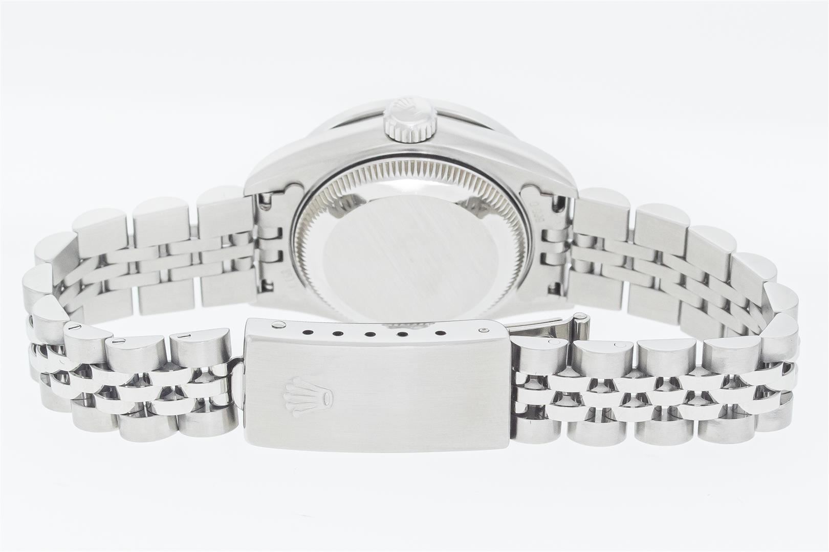 One Ladies Pre Owned Stainless Steel Rolex Datejust Polished Bright with Satin Finish, Serviced & Electronically Tested, Stainless Steel Case: 26mm, Rolex Stainless Steel Crown, Custom Bezel: New Stainless Steel Diamond Bezel, Diamond Count: 40 Diamonds On Bezel. Custom Crystal: New Sapphire With Magnified Date Window. Custom Hands: New Luminescent Hands. Rolex Movement: Automatic Winding Quickset Movement 2235. Rolex Dial: Silver With Index Hour Markers And Lumi Dots. Date Window: 3 O'Clock Position Date Display, Model: Quickset Datejust. Condition: G-6 Extra Fine. Rolex Bracelet: Stainless Steel Jubilee Band. Bright Polish & Satin Finish. 6.0 Inch Length, Adjustable. Standard Clasp, With Rolex Logo. This Watch Has Been Serviced Time Tested And Is In Excellent Condition It Is Free Of All Scratches And Dents.