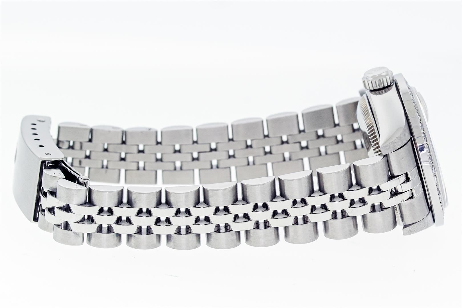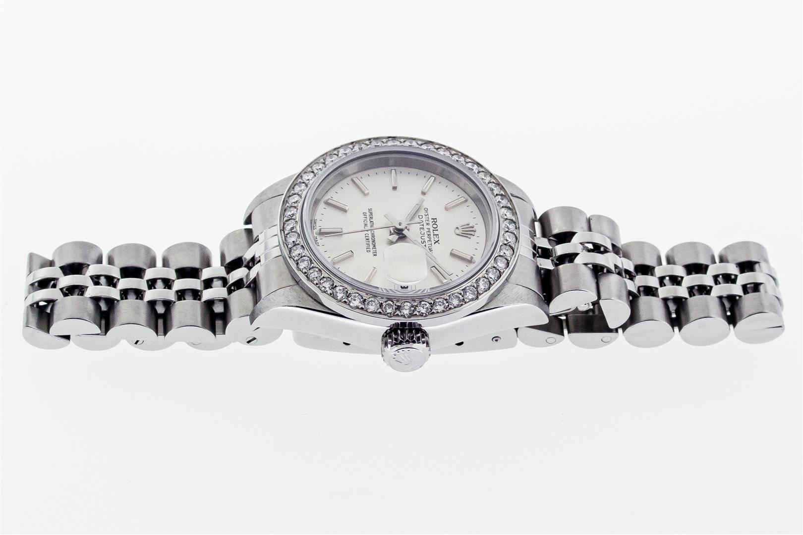One Ladies Pre Owned Stainless Steel Rolex Datejust Polished Bright with Satin Finish, Serviced & Electronically Tested, Stainless Steel Case: 26mm, Rolex Stainless Steel Crown, Custom Bezel: New Stainless Steel Diamond Bezel, Diamond Count: 40 Diamonds On Bezel. Custom Crystal: New Sapphire With Magnified Date Window. Custom Hands: New Luminescent Hands. Rolex Movement: Automatic Winding Quickset Movement 2235. Rolex Dial: Silver With Index Hour Markers And Lumi Dots. Date Window: 3 O'Clock Position Date Display, Model: Quickset Datejust. Condition: G-6 Extra Fine. Rolex Bracelet: Stainless Steel Jubilee Band. Bright Polish & Satin Finish. 6.0 Inch Length, Adjustable. Standard Clasp, With Rolex Logo. This Watch Has Been Serviced Time Tested And Is In Excellent Condition It Is Free Of All Scratches And Dents.