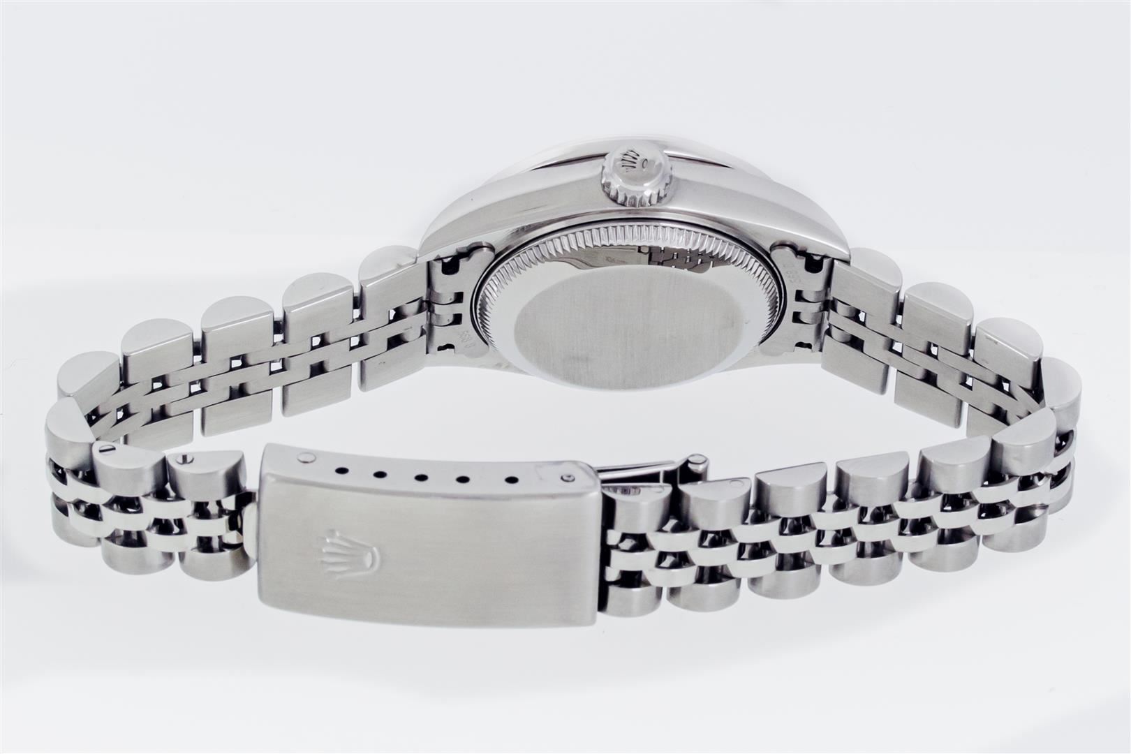 One Ladies Pre Owned Quickset Stainless Steel Rolex Datejust Polished Bright with Satin Finish, Serviced & Electronically Tested, Stainless Steel Case: 26mm, Custom Diamond Lugs: Added Diamonds On Lugs, Diamond Count: 24 Diamonds On Lugs. Rolex Stainless Steel Crown, Custom Bezel: New 18K White Gold Beadset Diamond Bezel, Diamond Count: 32 Diamonds On Bezel. Custom Crystal: New Sapphire With Magnified Date Window. Custom Hands: New Hands. Rolex Movement: Automatic Winding Movement 2235. Rolex Dial: Silver Index With Dash Track & Lumi Dots. Date Window: 3 O'Clock Position Date Display, Model: Quickset Datejust. Condition: G-6 Extra Fine. Rolex Bracelet: Stainless Steel Jubilee Band. Bright Polish & Satin Finish. 6.0 Inch Length, Adjustable. Standard Clasp, With Rolex Logo. This Watch Has Been Serviced Time Tested And Is In Excellent Condition It Is Free Of All Scratches And Dents.