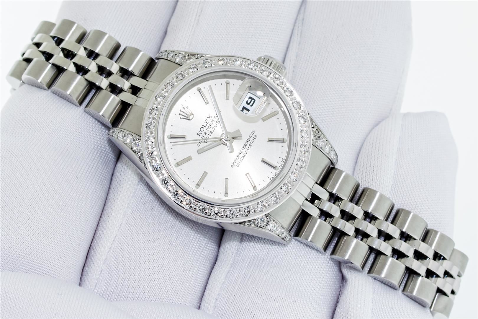 One Ladies Pre Owned Quickset Stainless Steel Rolex Datejust Polished Bright with Satin Finish, Serviced & Electronically Tested, Stainless Steel Case: 26mm, Custom Diamond Lugs: Added Diamonds On Lugs, Diamond Count: 24 Diamonds On Lugs. Rolex Stainless Steel Crown, Custom Bezel: New 18K White Gold Beadset Diamond Bezel, Diamond Count: 32 Diamonds On Bezel. Custom Crystal: New Sapphire With Magnified Date Window. Custom Hands: New Hands. Rolex Movement: Automatic Winding Movement 2235. Rolex Dial: Silver Index With Dash Track & Lumi Dots. Date Window: 3 O'Clock Position Date Display, Model: Quickset Datejust. Condition: G-6 Extra Fine. Rolex Bracelet: Stainless Steel Jubilee Band. Bright Polish & Satin Finish. 6.0 Inch Length, Adjustable. Standard Clasp, With Rolex Logo. This Watch Has Been Serviced Time Tested And Is In Excellent Condition It Is Free Of All Scratches And Dents.