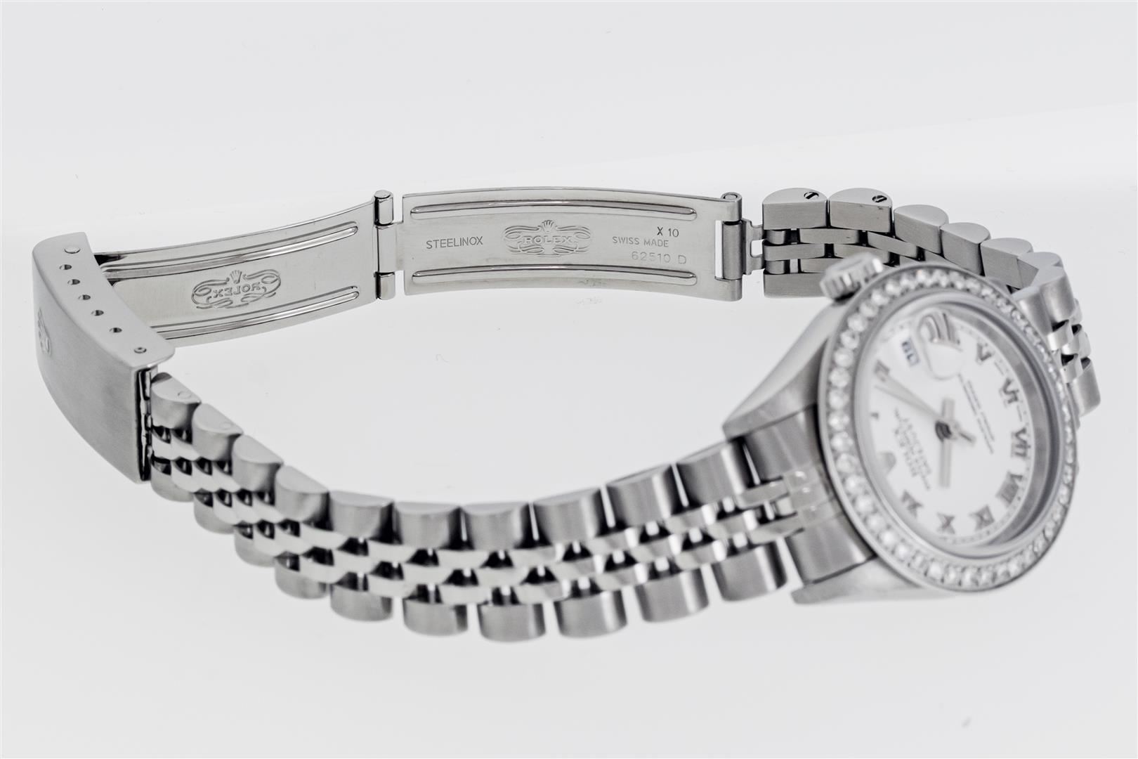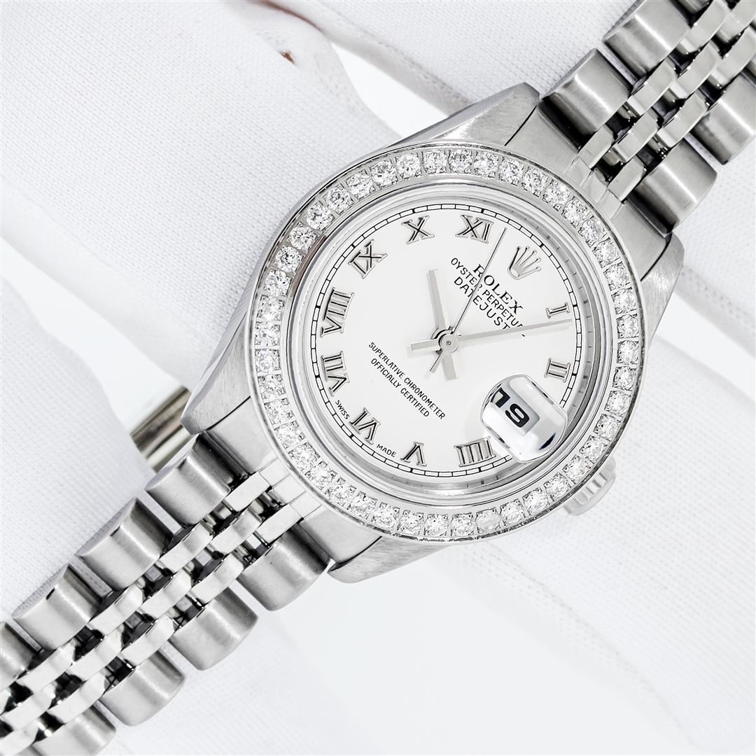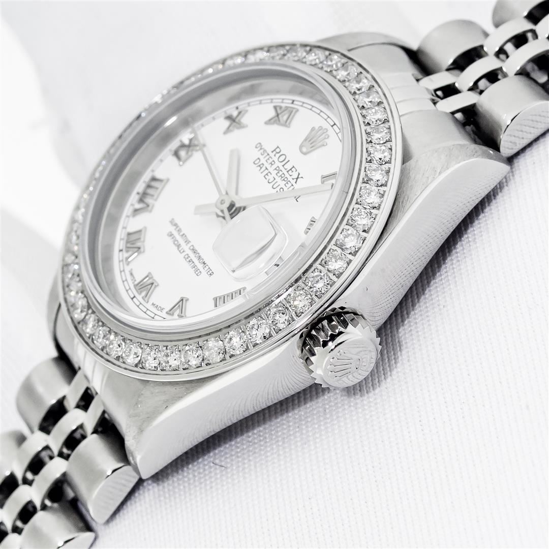 One Ladies Pre Owned Quickset Stainless Steel Rolex Datejust Polished Bright with Satin Finish, Serviced & Electronically Tested, Stainless Steel Case: 26mm, Rolex Stainless Steel Crown, Custom Bezel: New Stainless Steel Diamond Bezel, Diamond Count: 40 Diamonds On Bezel. Custom Crystal: New Sapphire With Magnified Date Window. Custom Hands: New Hands. Rolex Movement: Automatic Winding Quickset Movement 2235. Rolex Dial: White Roman With Square Track. Date Window: 3 O'Clock Position Date Display, Model: Quickset Datejust. Condition: G-6 Extra Fine. Rolex Bracelet: Stainless Steel Jubilee Band. Bright Polish & Satin Finish. 6.0 Inch Length, Adjustable. Standard Clasp, With Rolex Logo. This Watch Has Been Serviced Time Tested And Is In Excellent Condition It Is Free Of All Scratches And Dents.