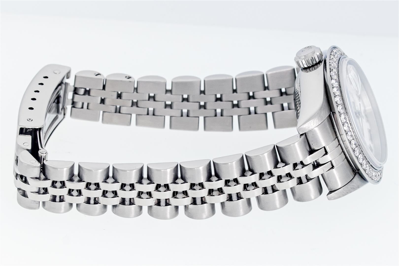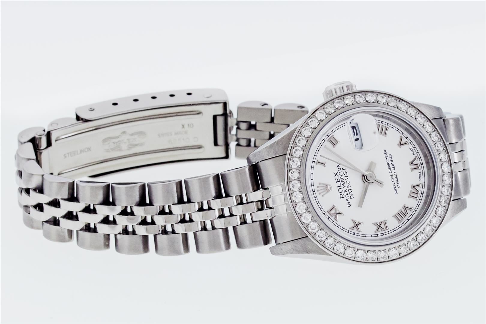 One Ladies Pre Owned Quickset Stainless Steel Rolex Datejust Polished Bright with Satin Finish, Serviced & Electronically Tested, Stainless Steel Case: 26mm, Rolex Stainless Steel Crown, Custom Bezel: New Stainless Steel Diamond Bezel, Diamond Count: 40 Diamonds On Bezel. Custom Crystal: New Sapphire With Magnified Date Window. Custom Hands: New Hands. Rolex Movement: Automatic Winding Quickset Movement 2235. Rolex Dial: White Roman With Square Track. Date Window: 3 O'Clock Position Date Display, Model: Quickset Datejust. Condition: G-6 Extra Fine. Rolex Bracelet: Stainless Steel Jubilee Band. Bright Polish & Satin Finish. 6.0 Inch Length, Adjustable. Standard Clasp, With Rolex Logo. This Watch Has Been Serviced Time Tested And Is In Excellent Condition It Is Free Of All Scratches And Dents.