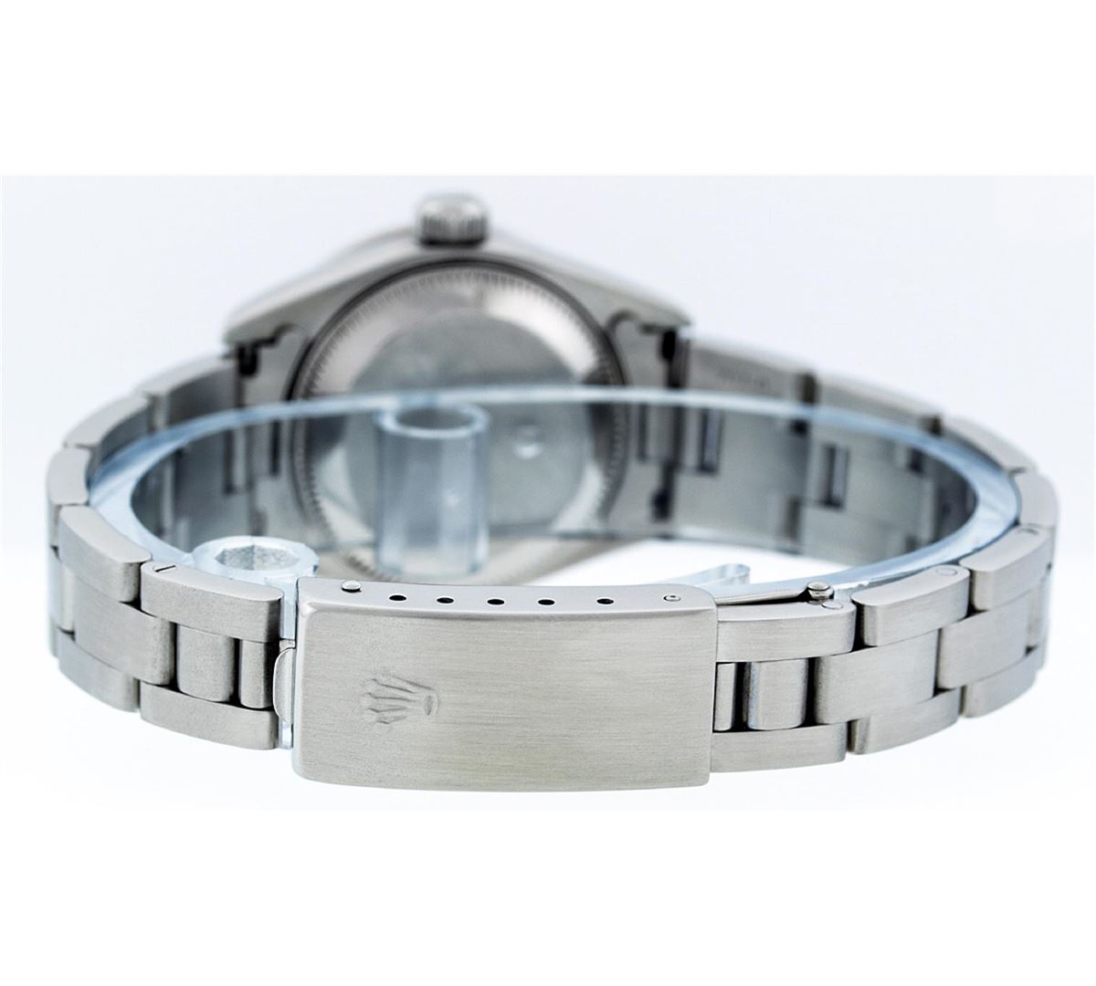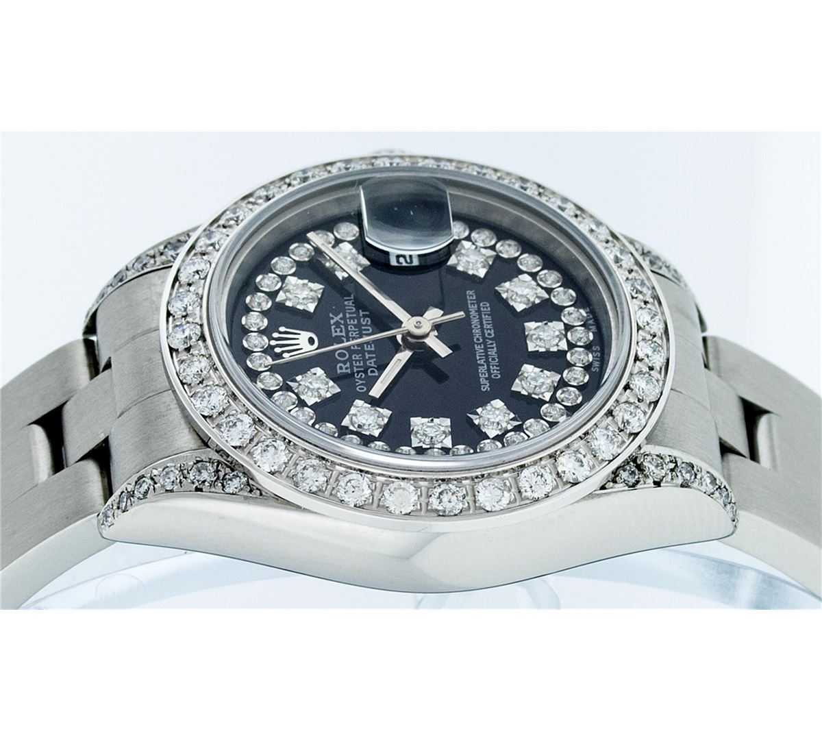 One Ladies Rolex Datejust Polished Bright with Satin Finish, Serviced & Electronically Tested, Stainless Steel Case:26mm, Stainless Steel Crown, Diamond Lugs: 16 Diamonds On Lugs, Clarity: SI-VS, Color: G to H. Custom Bezel: 18K White Gold Beadset Bezel, Diamond Count: 32 Diamonds, Total Weight 1.00 Carat, Clarity: SI-VS, Color: G to H. Custom Crystal: Synthetic Sapphire Cyclops Lens. Movement: Automatic Winding Movement Caliber 2030. Custom Dial: Refinished Black With String Diamond Dial VVS, 43 Diamonds in Dial G To H In Color, Clarity: VVS. Date Window: 3 O'Clock Position Date Display, Model: No Hole Datejust Condition: G-6 Extra Fine. Bracelet: Stainless Steel Oyster Band. Bright Polish & Satin Finish. 6.0 Inch Length, Adjustable. Standard Clasp, With Rolex Logo. Comes with a 6 month warranty card.