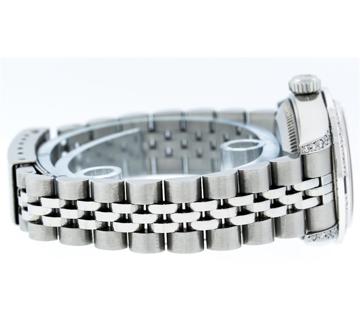 One Ladies Rolex Datejust Polished Bright with Satin Finish, Serviced & Electronically Tested, Stainless Steel Case:26mm, Stainless Steel Crown, Diamond Lugs: 16 Diamonds On Lugs, Clarity: SI-VS, Color: G to H. Custom Bezel: 18K White Gold Sapphire Beadset Bezel, Diamond Count: 28 Diamonds + 4 Sapphires, Total Weight 1.00 Carat, Clarity: SI-VS, Color: G to H. Custom Crystal: Synthetic Sapphire Cyclops Lens. Movement: Automatic Winding Movement Caliber 2030. Custom Dial: Refinished Blue With String Diamond Dial VVS, 43 Diamonds in Dial G To H In Color, Clarity: VVS. Date Window: 3 O'Clock Position Date Display, Model: No Hole Datejust Condition: G-6 Extra Fine. Bracelet: Stainless Steel Jubilee. Bright Polish & Satin Finish. 6.0 Inch Length, Adjustable. Standard Clasp, With Rolex Logo. Comes with a 6 month warranty card.