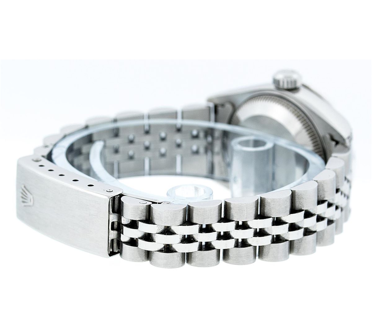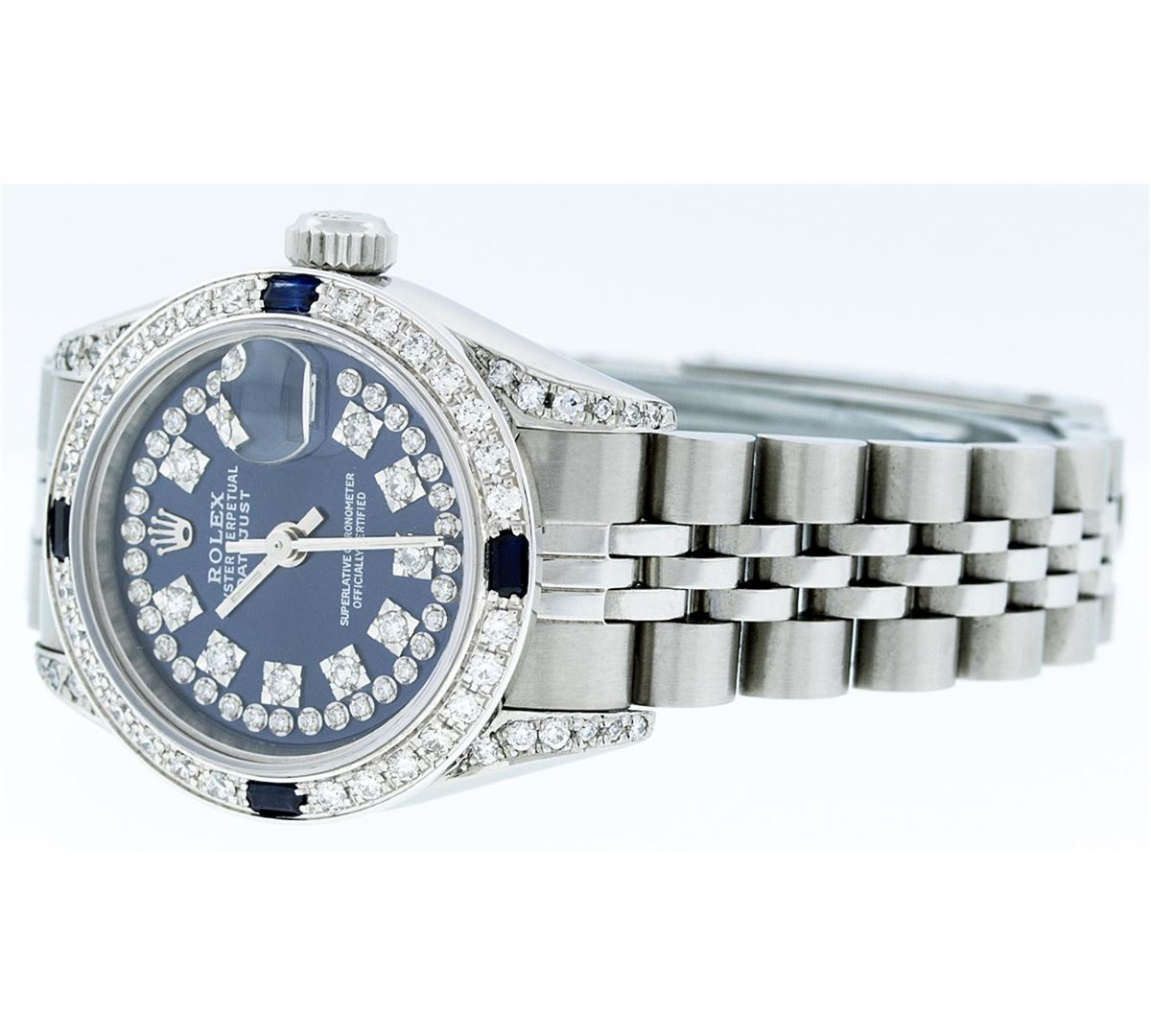 One Ladies Rolex Datejust Polished Bright with Satin Finish, Serviced & Electronically Tested, Stainless Steel Case:26mm, Stainless Steel Crown, Diamond Lugs: 16 Diamonds On Lugs, Clarity: SI-VS, Color: G to H. Custom Bezel: 18K White Gold Sapphire Beadset Bezel, Diamond Count: 28 Diamonds + 4 Sapphires, Total Weight 1.00 Carat, Clarity: SI-VS, Color: G to H. Custom Crystal: Synthetic Sapphire Cyclops Lens. Movement: Automatic Winding Movement Caliber 2030. Custom Dial: Refinished Blue With String Diamond Dial VVS, 43 Diamonds in Dial G To H In Color, Clarity: VVS. Date Window: 3 O'Clock Position Date Display, Model: No Hole Datejust Condition: G-6 Extra Fine. Bracelet: Stainless Steel Jubilee. Bright Polish & Satin Finish. 6.0 Inch Length, Adjustable. Standard Clasp, With Rolex Logo. Comes with a 6 month warranty card.