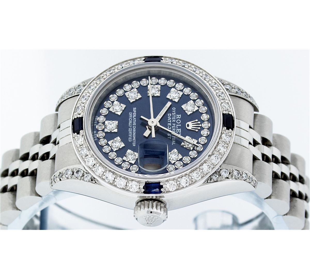 One Ladies Rolex Datejust Polished Bright with Satin Finish, Serviced & Electronically Tested, Stainless Steel Case:26mm, Stainless Steel Crown, Diamond Lugs: 16 Diamonds On Lugs, Clarity: SI-VS, Color: G to H. Custom Bezel: 18K White Gold Sapphire Beadset Bezel, Diamond Count: 28 Diamonds + 4 Sapphires, Total Weight 1.00 Carat, Clarity: SI-VS, Color: G to H. Custom Crystal: Synthetic Sapphire Cyclops Lens. Movement: Automatic Winding Movement Caliber 2030. Custom Dial: Refinished Blue With String Diamond Dial VVS, 43 Diamonds in Dial G To H In Color, Clarity: VVS. Date Window: 3 O'Clock Position Date Display, Model: No Hole Datejust Condition: G-6 Extra Fine. Bracelet: Stainless Steel Jubilee. Bright Polish & Satin Finish. 6.0 Inch Length, Adjustable. Standard Clasp, With Rolex Logo. Comes with a 6 month warranty card.