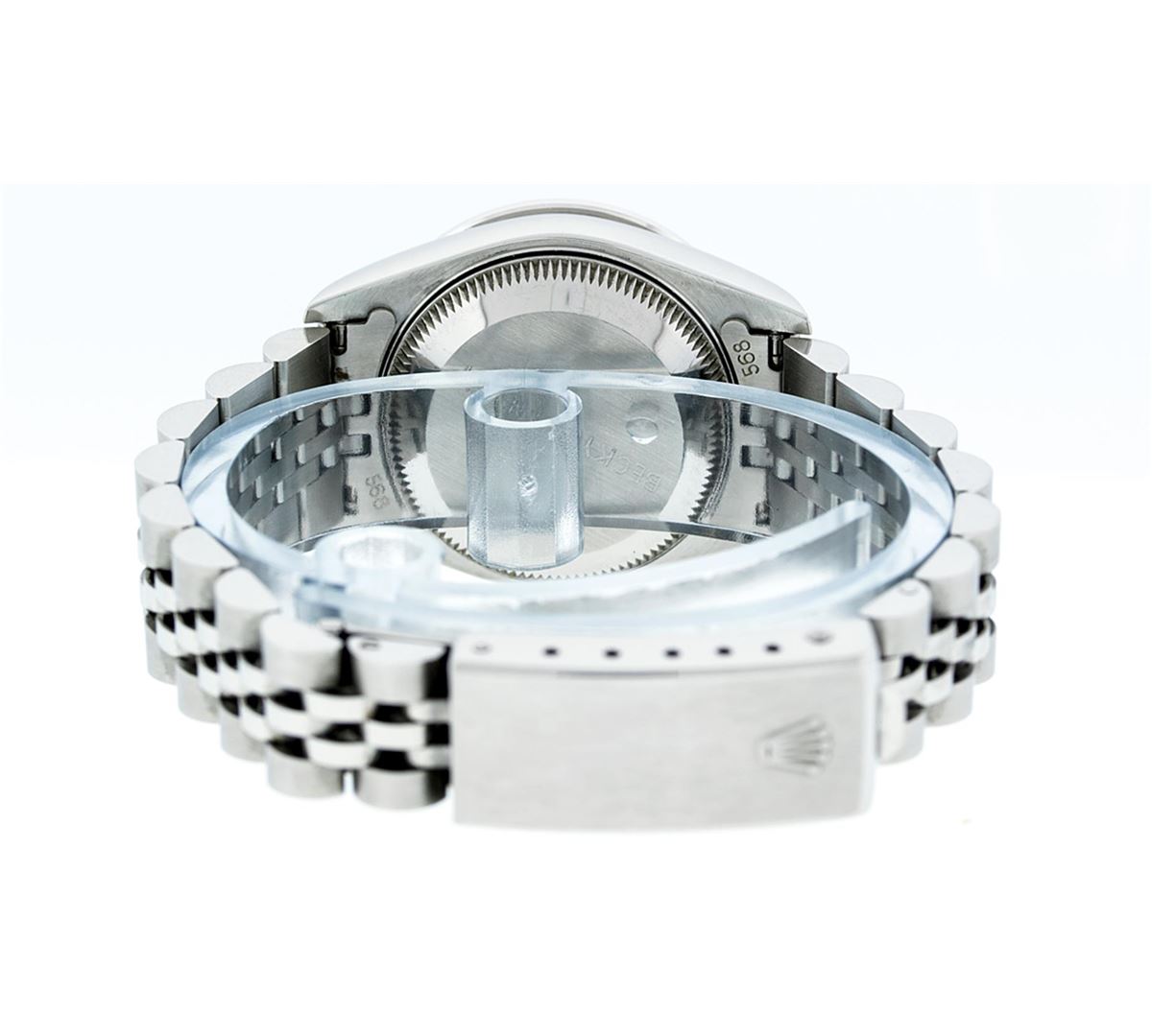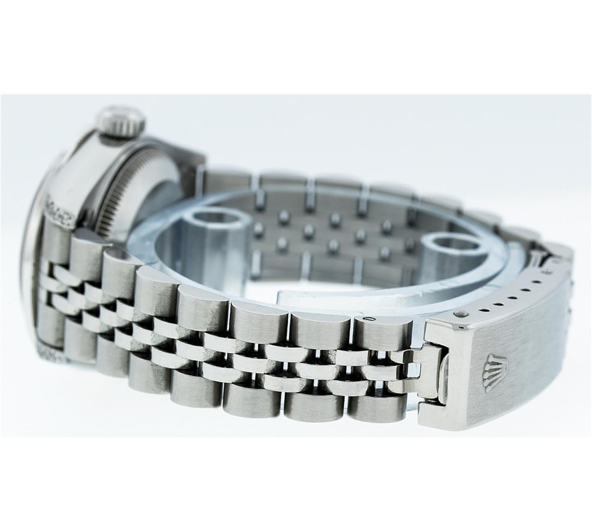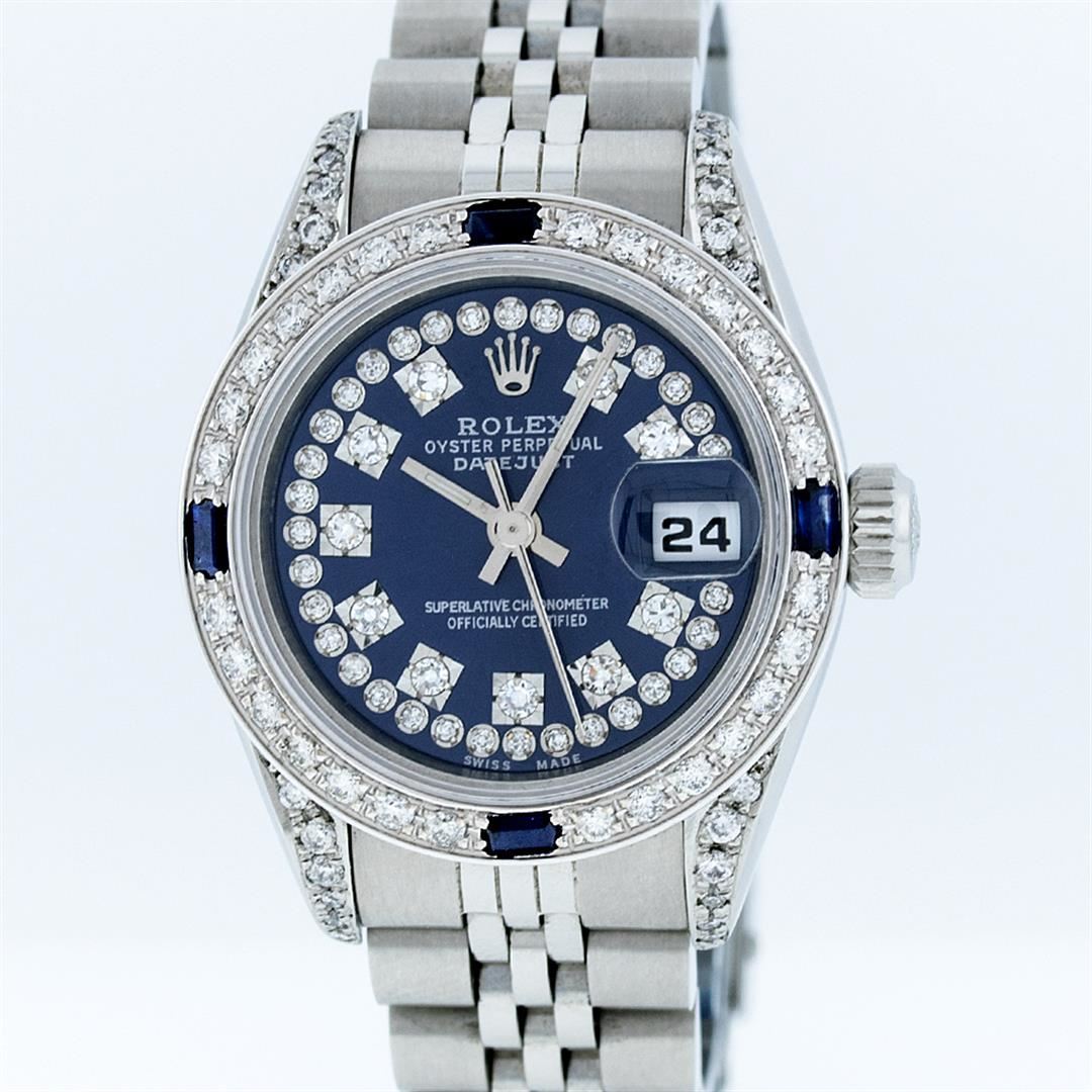 One Ladies Rolex Datejust Polished Bright with Satin Finish, Serviced & Electronically Tested, Stainless Steel Case:26mm, Stainless Steel Crown, Diamond Lugs: 16 Diamonds On Lugs, Clarity: SI-VS, Color: G to H. Custom Bezel: 18K White Gold Sapphire Beadset Bezel, Diamond Count: 28 Diamonds + 4 Sapphires, Total Weight 1.00 Carat, Clarity: SI-VS, Color: G to H. Custom Crystal: Synthetic Sapphire Cyclops Lens. Movement: Automatic Winding Movement Caliber 2030. Custom Dial: Refinished Blue With String Diamond Dial VVS, 43 Diamonds in Dial G To H In Color, Clarity: VVS. Date Window: 3 O'Clock Position Date Display, Model: No Hole Datejust Condition: G-6 Extra Fine. Bracelet: Stainless Steel Jubilee. Bright Polish & Satin Finish. 6.0 Inch Length, Adjustable. Standard Clasp, With Rolex Logo. Comes with a 6 month warranty card.
