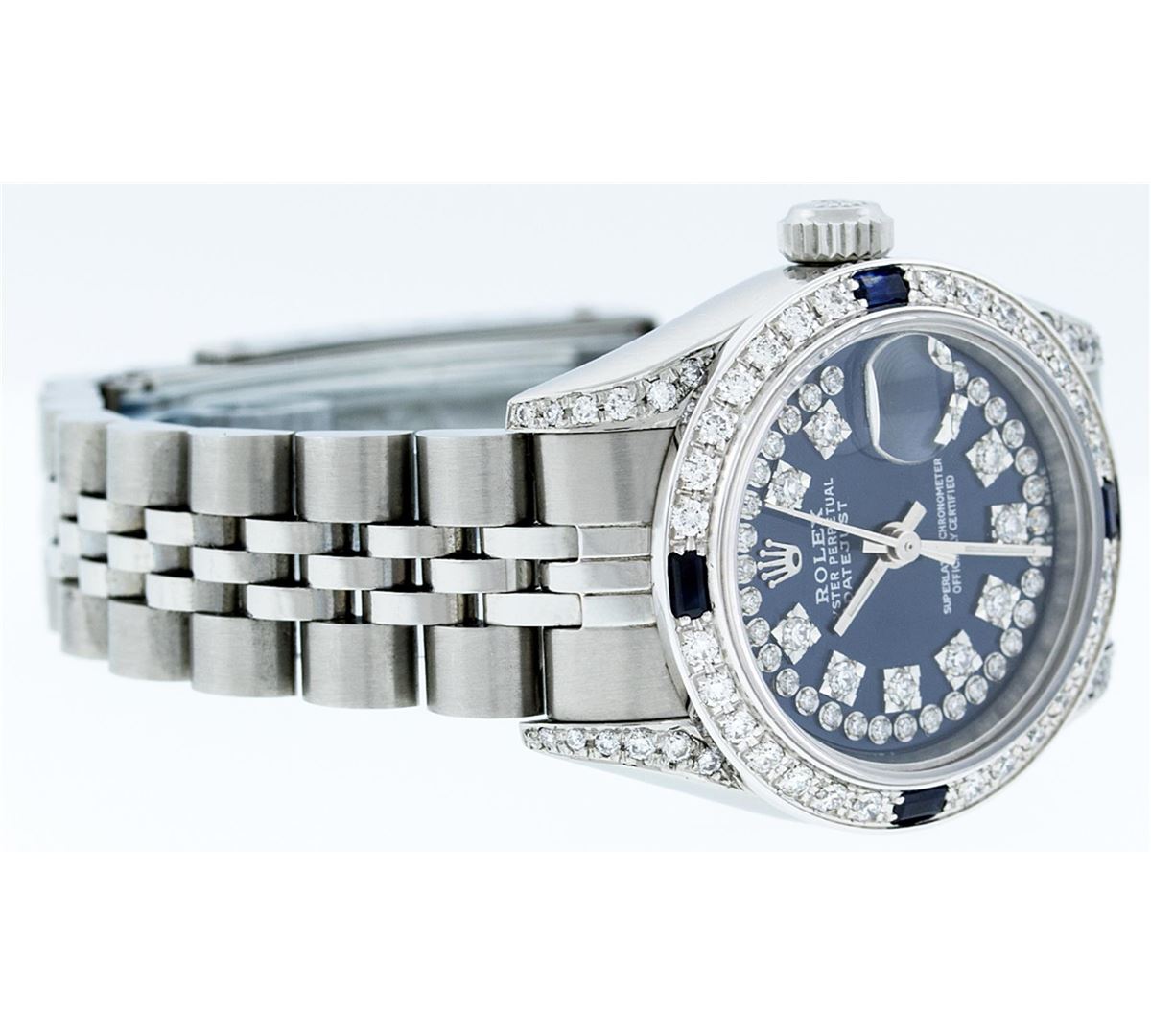 One Ladies Rolex Datejust Polished Bright with Satin Finish, Serviced & Electronically Tested, Stainless Steel Case:26mm, Stainless Steel Crown, Diamond Lugs: 16 Diamonds On Lugs, Clarity: SI-VS, Color: G to H. Custom Bezel: 18K White Gold Sapphire Beadset Bezel, Diamond Count: 28 Diamonds + 4 Sapphires, Total Weight 1.00 Carat, Clarity: SI-VS, Color: G to H. Custom Crystal: Synthetic Sapphire Cyclops Lens. Movement: Automatic Winding Movement Caliber 2030. Custom Dial: Refinished Blue With String Diamond Dial VVS, 43 Diamonds in Dial G To H In Color, Clarity: VVS. Date Window: 3 O'Clock Position Date Display, Model: No Hole Datejust Condition: G-6 Extra Fine. Bracelet: Stainless Steel Jubilee. Bright Polish & Satin Finish. 6.0 Inch Length, Adjustable. Standard Clasp, With Rolex Logo. Comes with a 6 month warranty card.