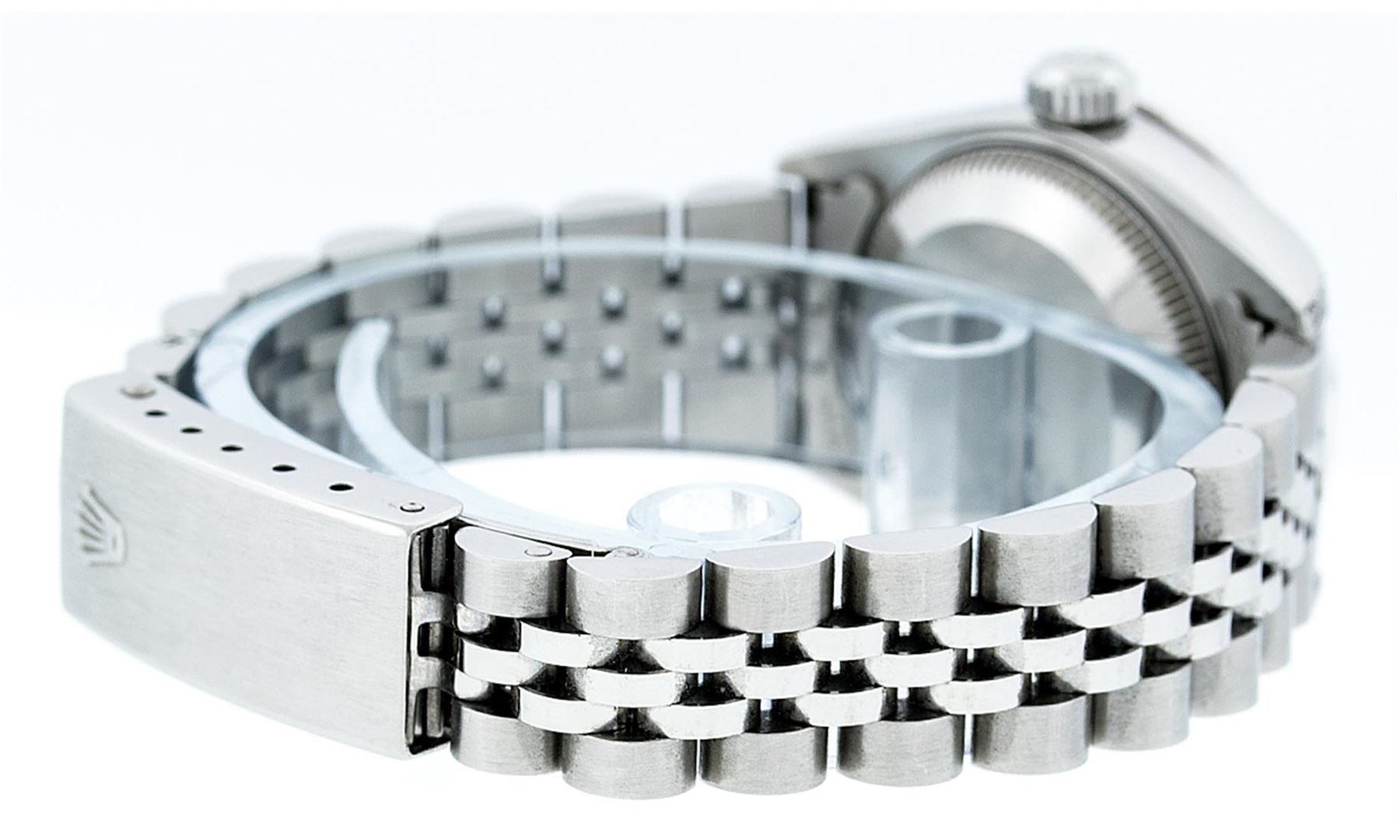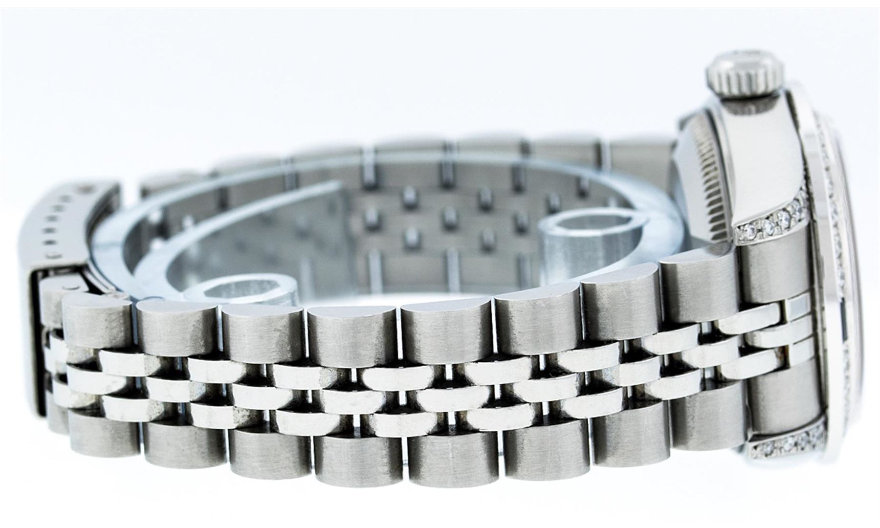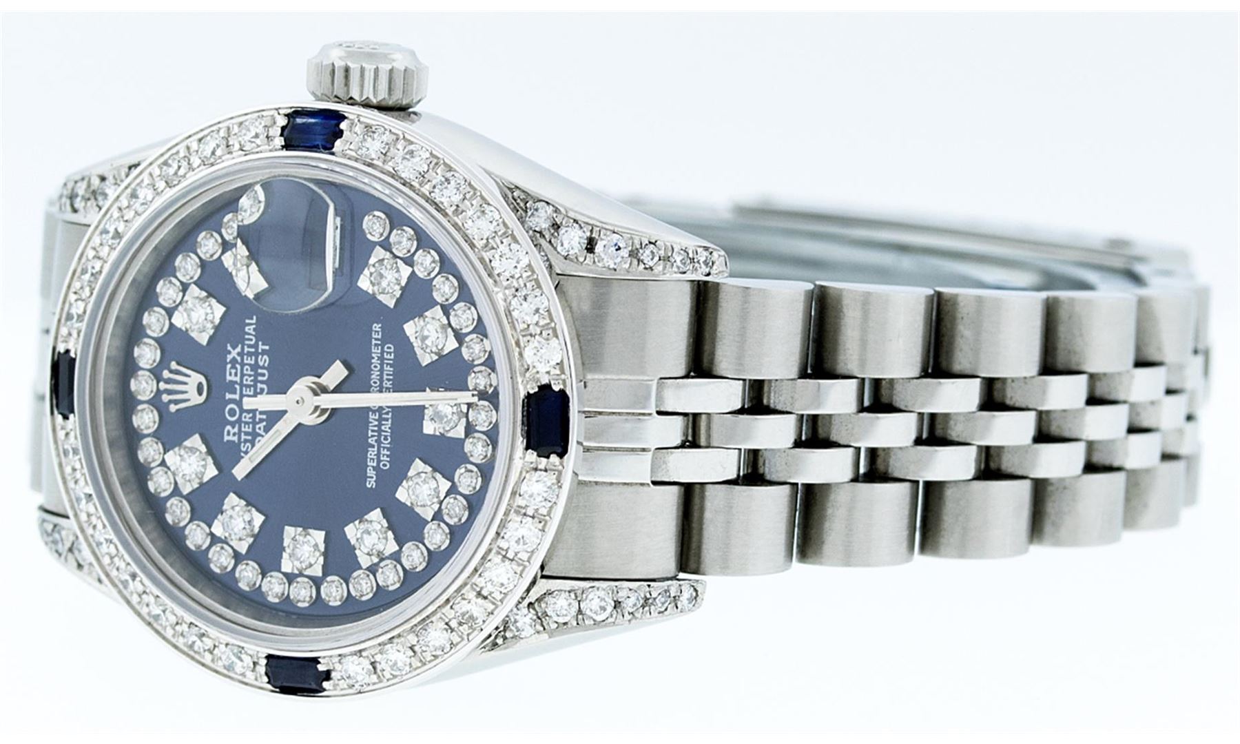 One Ladies Rolex Datejust Polished Bright with Satin Finish, Serviced & Electronically Tested, Stainless Steel Case:26mm, Stainless Steel Crown, Diamond Lugs: 16 Diamonds On Lugs, Clarity: SI-VS, Color: G to H. Custom Bezel: 18K White Gold Sapphire Beadset Bezel, Diamond Count: 28 Diamonds + 4 Sapphires, Total Weight 1.00 Carat, Clarity: SI-VS, Color: G to H. Custom Crystal: Synthetic Sapphire Cyclops Lens. Movement: Automatic Winding Movement Caliber 2030. Custom Dial: Refinished Blue With String Diamond Dial VVS, 43 Diamonds in Dial G To H In Color, Clarity: VVS. Date Window: 3 O'Clock Position Date Display, Model: No Hole Datejust Condition: G-6 Extra Fine. Bracelet: Stainless Steel Jubilee. Bright Polish & Satin Finish. 6.0 Inch Length, Adjustable. Standard Clasp, With Rolex Logo. Comes with a 6 month warranty card.