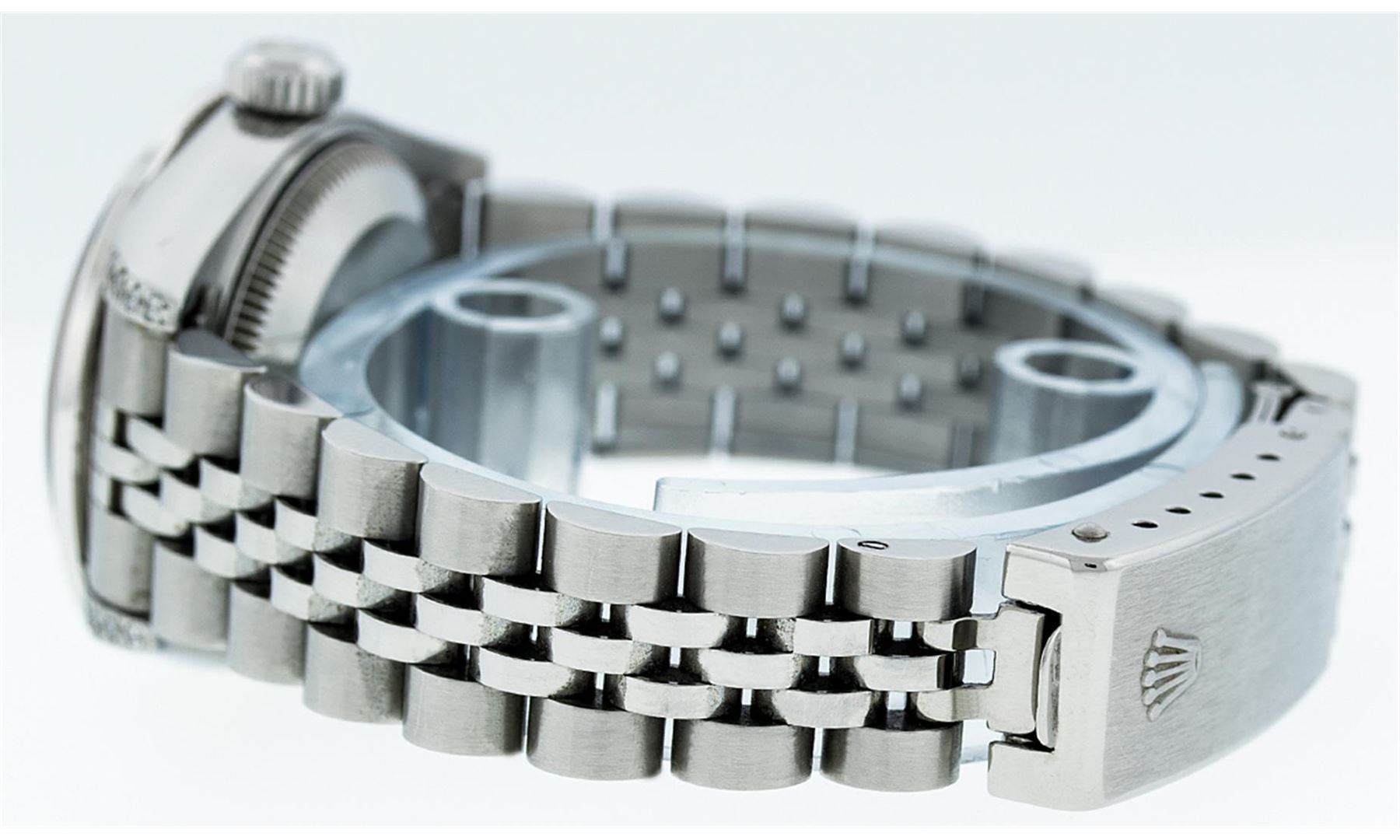 One Ladies Rolex Datejust Polished Bright with Satin Finish, Serviced & Electronically Tested, Stainless Steel Case:26mm, Stainless Steel Crown, Diamond Lugs: 16 Diamonds On Lugs, Clarity: SI-VS, Color: G to H. Custom Bezel: 18K White Gold Sapphire Beadset Bezel, Diamond Count: 28 Diamonds + 4 Sapphires, Total Weight 1.00 Carat, Clarity: SI-VS, Color: G to H. Custom Crystal: Synthetic Sapphire Cyclops Lens. Movement: Automatic Winding Movement Caliber 2030. Custom Dial: Refinished Blue With String Diamond Dial VVS, 43 Diamonds in Dial G To H In Color, Clarity: VVS. Date Window: 3 O'Clock Position Date Display, Model: No Hole Datejust Condition: G-6 Extra Fine. Bracelet: Stainless Steel Jubilee. Bright Polish & Satin Finish. 6.0 Inch Length, Adjustable. Standard Clasp, With Rolex Logo. Comes with a 6 month warranty card.