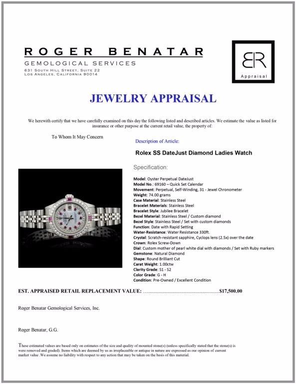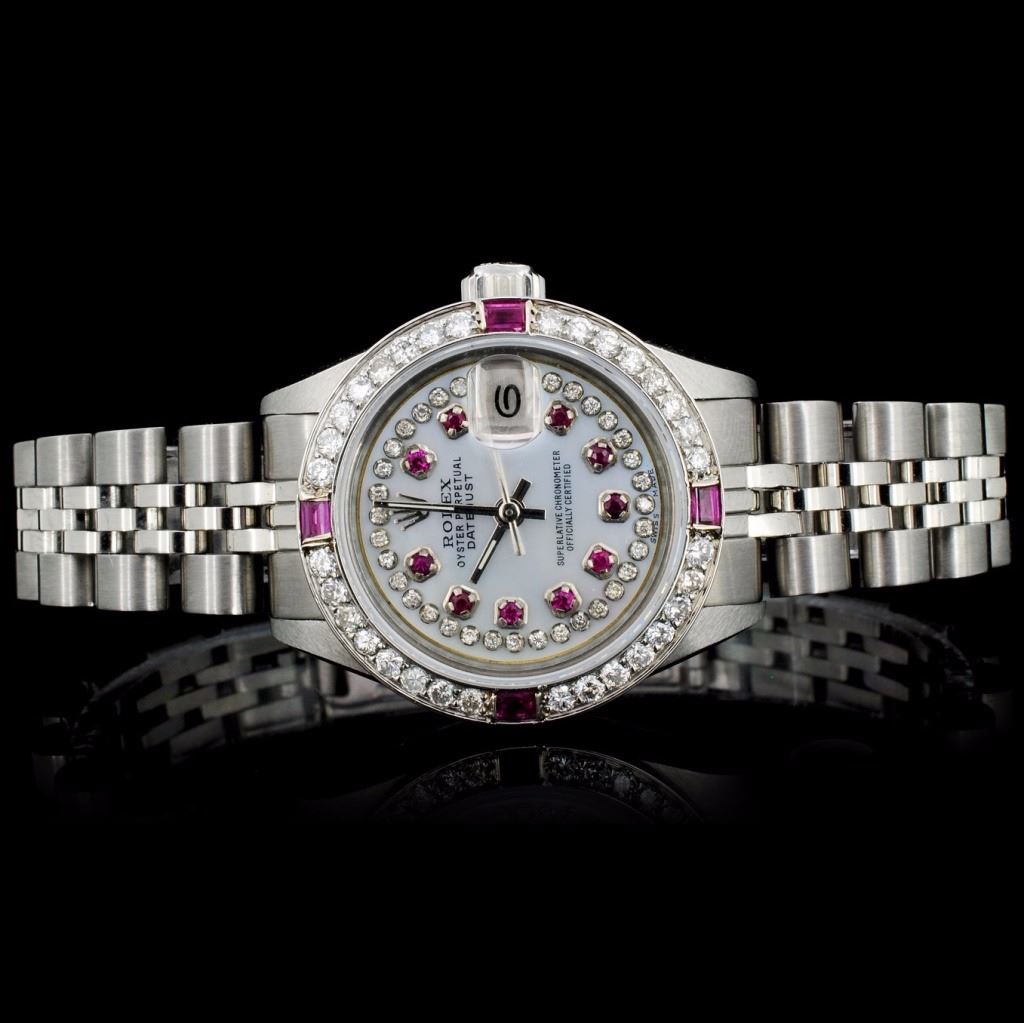 Dial: Custom mother of pearl white dial with diamonds / Set with Ruby markers