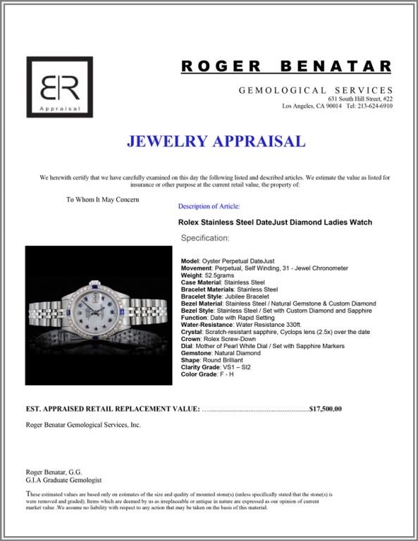 Dial: Mother of Pearl White Dial / Set with Sapphire Markers