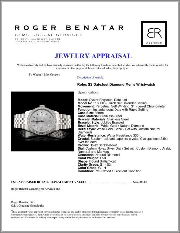 Dial: Custom Rolex Silver Dial / Set with Custom Diamond Arabic Numeral and Markers