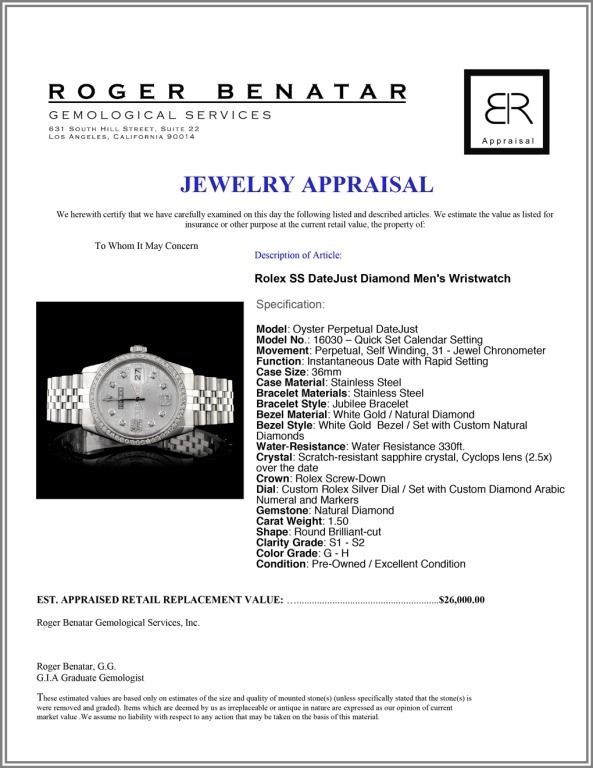 Dial: Custom Rolex Silver Dial / Set with Custom Diamond Arabic Numeral and Markers
