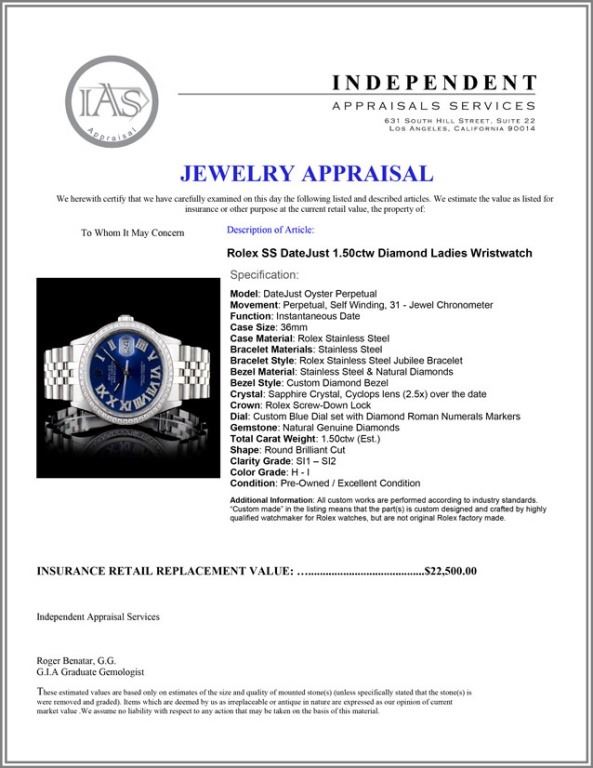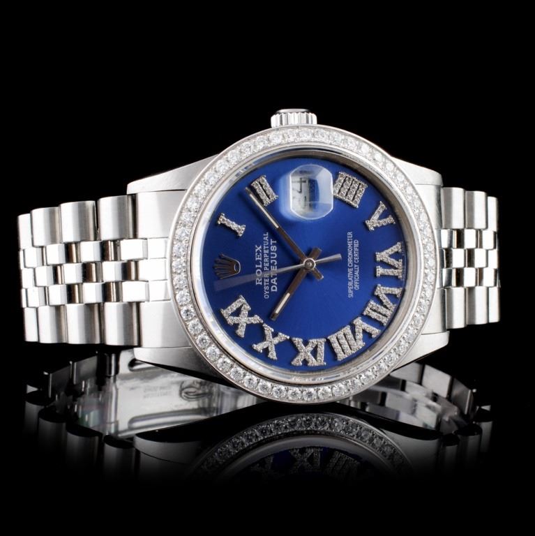 Dial: Custom Blue Dial set with Diamond Roman Numerals Markers