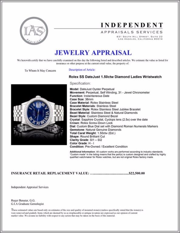 Dial: Custom Blue Dial set with Diamond Roman Numerals Markers