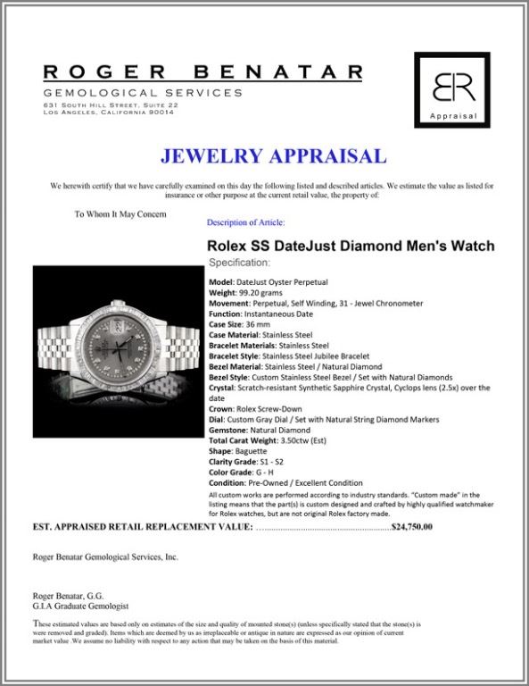 Dial: Custom Gray Dial / Set with Natural String Diamond Markers
