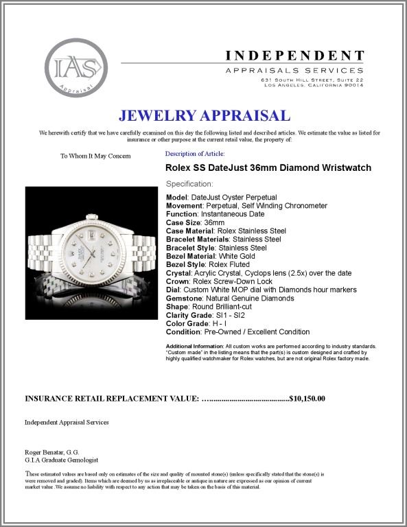 Dial: Custom White MOP dial with Diamonds hour markers