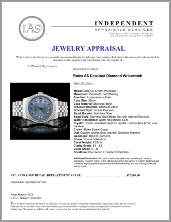 Dial: Custom Jubilee Blue Dial with Diamond Markers