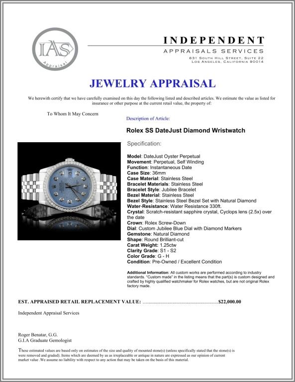 Dial: Custom Jubilee Blue Dial with Diamond Markers