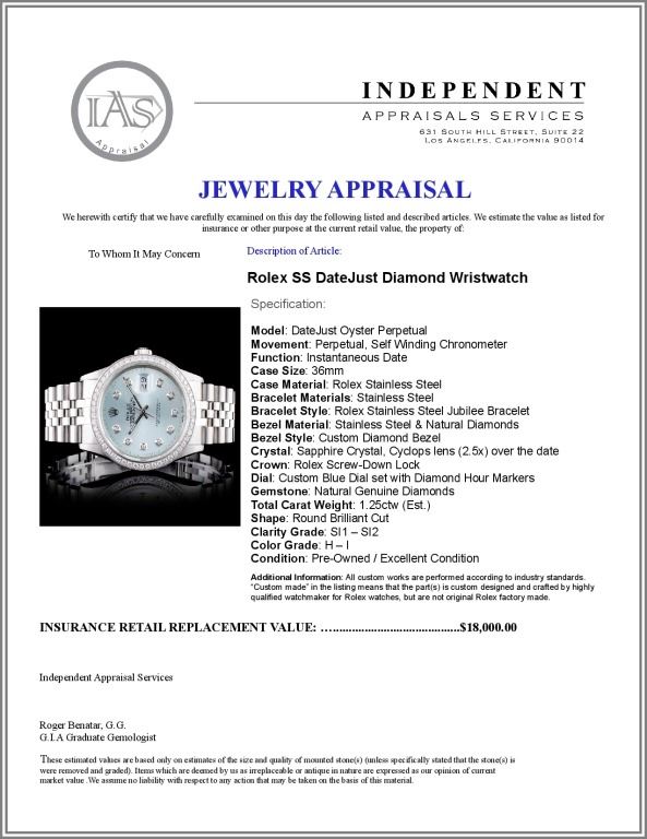 Dial: Custom Blue Dial set with Diamond Hour Markers
