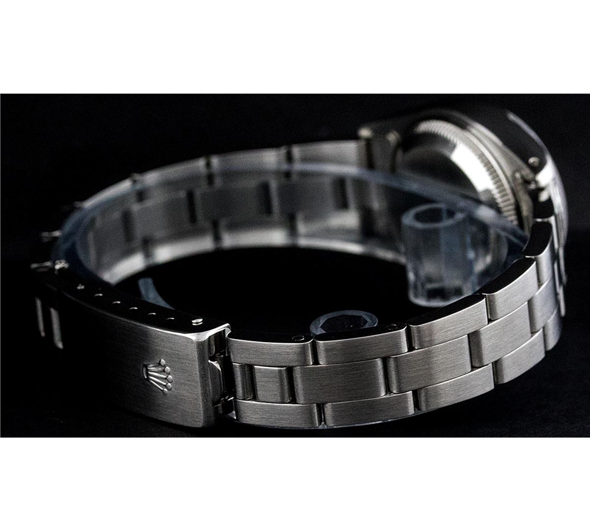 One Ladies Rolex Datejust Polished Bright with Satin Finish, Serviced & Electronically Tested, Stainless Steel Case:26mm, Stainless Steel Crown, Bezel:14K White Gold Fluted. Custom Crystal: Acrylic Cyclops Lens. Movement: Automatic Winding Movement Caliber 2030. Custom Dial: Slate Grey With Roman Hour Markers. Date Window: 3 O'Clock Position Date Display, Model: Datejust Condition: G-6 Extra Fine. Bracelet: Stainless Steel Oyster Band. Bright Polish & Satin Finish. 6.0 Inch Length, Adjustable. Standard Clasp, With Rolex Logo. Comes with a 6 month warranty card.
