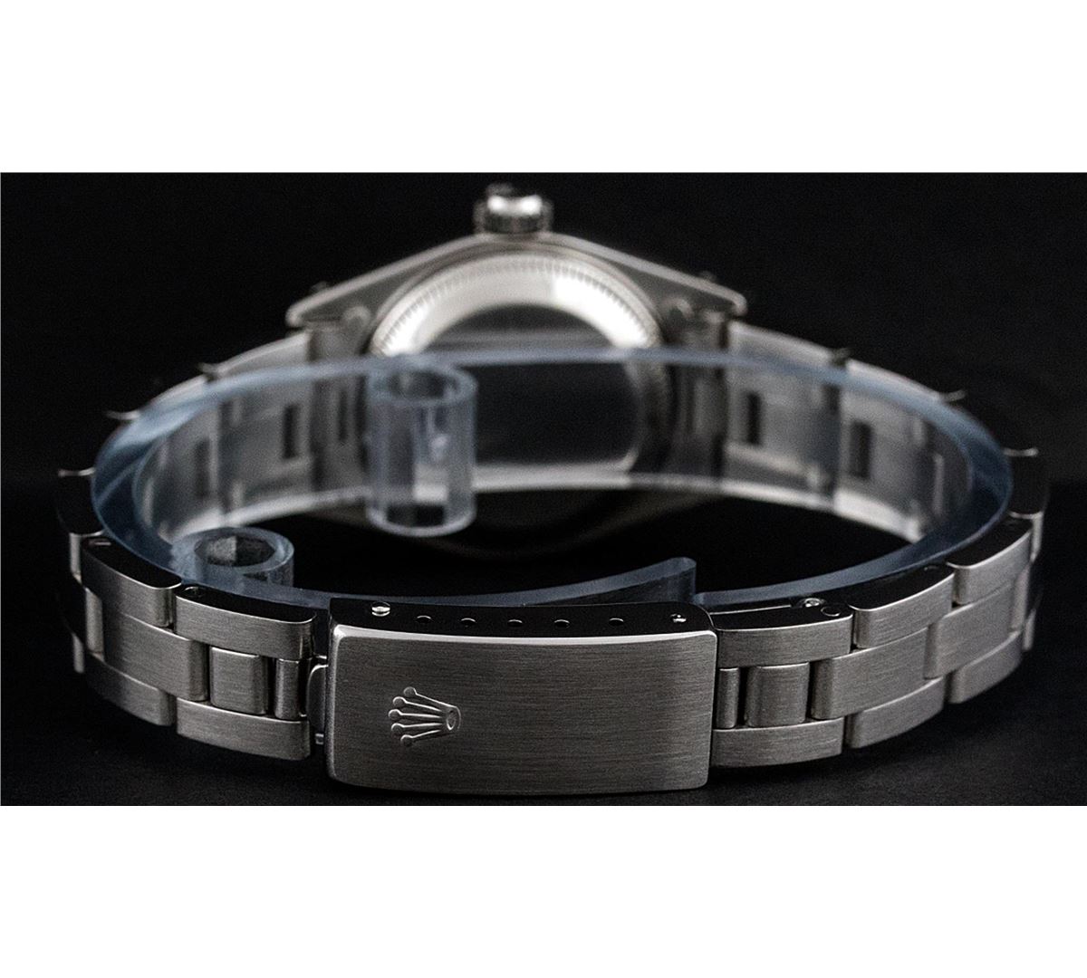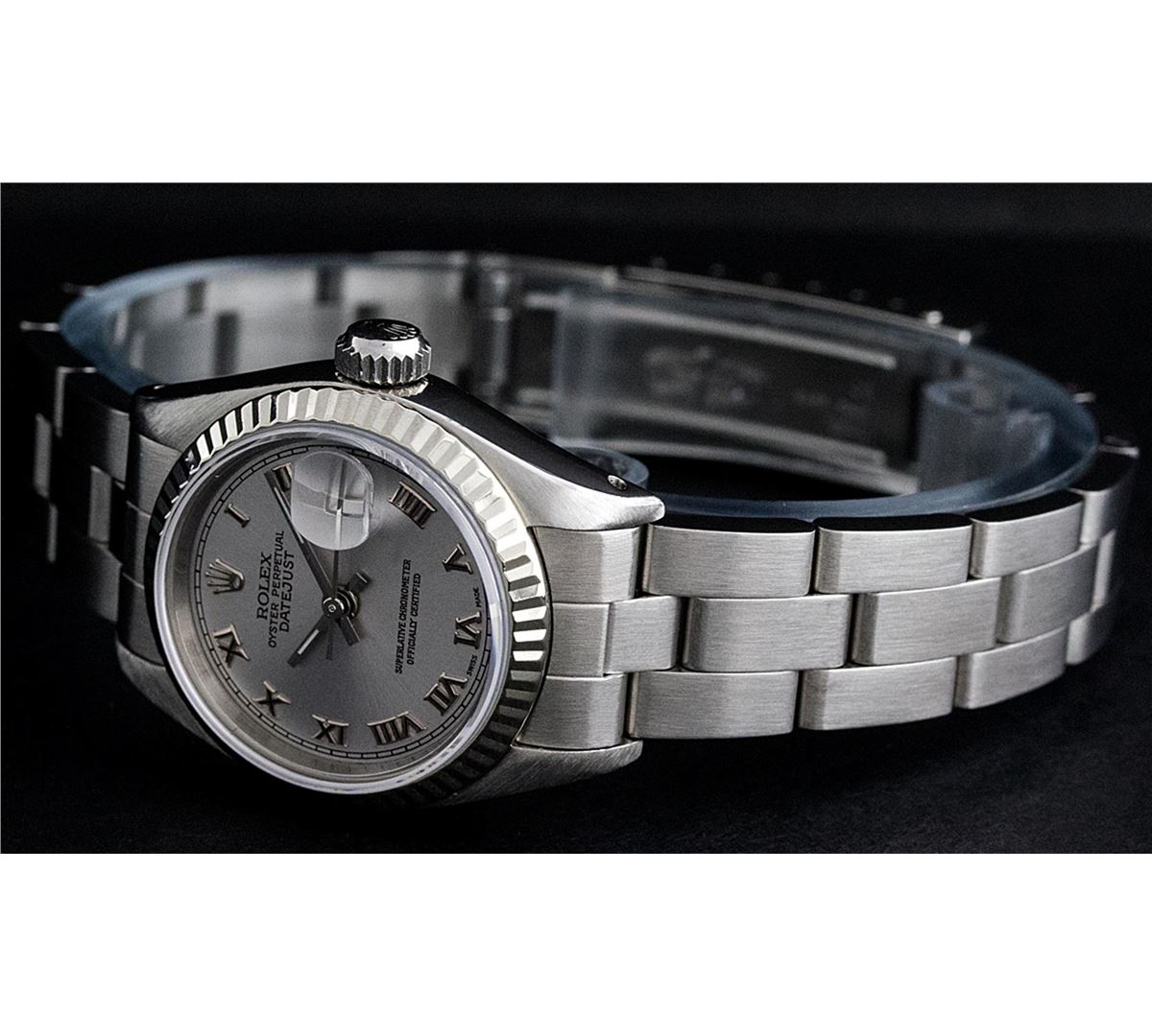 One Ladies Rolex Datejust Polished Bright with Satin Finish, Serviced & Electronically Tested, Stainless Steel Case:26mm, Stainless Steel Crown, Bezel:14K White Gold Fluted. Custom Crystal: Acrylic Cyclops Lens. Movement: Automatic Winding Movement Caliber 2030. Custom Dial: Slate Grey With Roman Hour Markers. Date Window: 3 O'Clock Position Date Display, Model: Datejust Condition: G-6 Extra Fine. Bracelet: Stainless Steel Oyster Band. Bright Polish & Satin Finish. 6.0 Inch Length, Adjustable. Standard Clasp, With Rolex Logo. Comes with a 6 month warranty card.