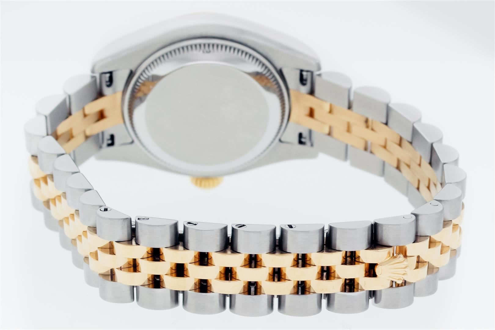 One Ladies Pre Owned Quickset Sapphire 2T 18K Yellow Gold & Stainless Steel Rolex Datejust Polished Bright with Satin Finish, Serviced & Electronically Tested, Rolex Stainless Steel Case: 26mm, Rolex 18K Yellow Gold Crown, Rolex Bezel: 18K Yellow Gold Fluted Bezel. Crystal: Sapphire With Magnified Date Window. Hands: Luminescent Hands. Rolex Movement: Automatic Winding Movement 2235. Rolex Dial: Silver Index With Dash Track. Date Window: 3 O'Clock Position Date Display, Model: Sapphire Quickset Datejust. Condition: G-6 Extra Fine. Rolex Bracelet: 18K Yellow Gold & Stainless Steel Jubilee Band. Bright Polish & Satin Finish. 6.0 Inch Length, Adjustable. Hidden Clap, With Rolex Logo. This Watch Has Been Serviced Time Tested And Is In Excellent Condition It Is Free Of All Scratches And Dents.